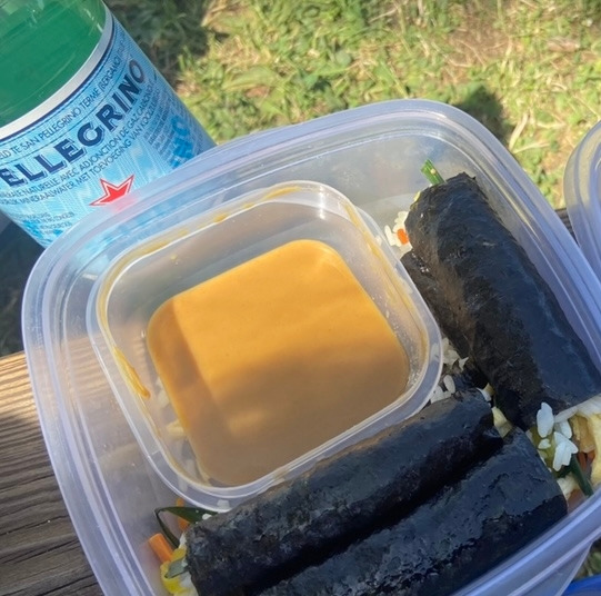 처음에는 소스 없이 김밥만 챙기려 했다. 하지만 아무래도 꼬마김밥에 겨자소스가 없다니 점심시간에 너무 아쉬울 것 같았다. 냉장고에 있던 디종 머스터드를 꺼내본다. 지금까지 겨자소스를 항상 한국 연겨자를 사용했던지라 어떨지 조금 확신이 없었다. 디종 머스터드를 푹 뜨고 약간의 간장, 식초, 설탕을 넣어 섞고 물을 조금조금 넣고 잘 섞어준다. 살짝 찍어 맛을 본다. 너무 맛있다. 연겨자를 쓸 때보다 훨씬 부드럽고 맛있다. 앞으로는 연겨자가 있어도 디종 머스터드를 쓸 것 같다. 성공한 소스를 소스통에 담아 챙겨 도시락을 마무리한다.