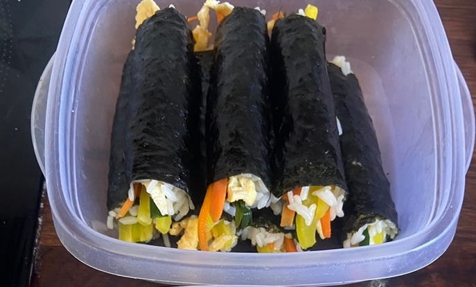 아시아 마켓에서 김밥을 해 먹으려고 사뒀던 단무지를 꺼내고, 김도 준비한다. 꼬마김밥을 위해서는 한 장의 김을 네 등분 해준다. 밥을 새로 하고 뜨끈한 밥을 떠 담아 참기름 가득, 소금을 뿌려 간을 해준다. 색색이 예쁘도록 단무지 외에도 당근을 채 썰어 볶아내 준다. 냉장고에 있던 시금치를 무쳐 초록색도 더해본다. 재료는 모두 준비됐다. 꼬마김밥은 간단하다. 밥을 얹고 최소한의 재료들을 얹어주고 손으로 돌돌 말아주면 끝이다.