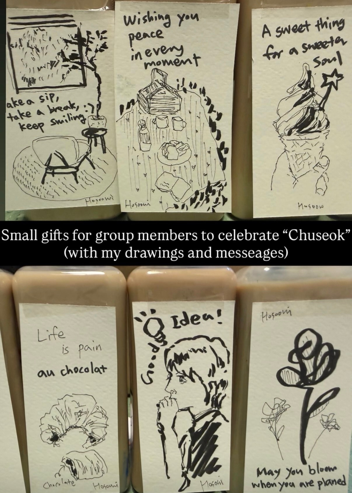 카페에서 휴식을 취하던 중이었다. 밀크티 맛집이었고, 직장 동료들에게 줄 가벼운 추석 선물을 고민 중이었다. 어설픈 싸구려 선물보다 그냥 선물 같지 않을 밀크티가 어쩌면 부담 없이 나을 거라 생각했다. 하지만 그냥 주기는 밋밋하니, 그림을 조금 그리고 거기에 메시지 좀 남기자 생각했다. 그렇게 13개의 밀크티에 각각 그림과 긍정의 응원 문구들을 적었다. 연구실에 가서, 쭉 나열하고는 각자 가져가도록 했다.