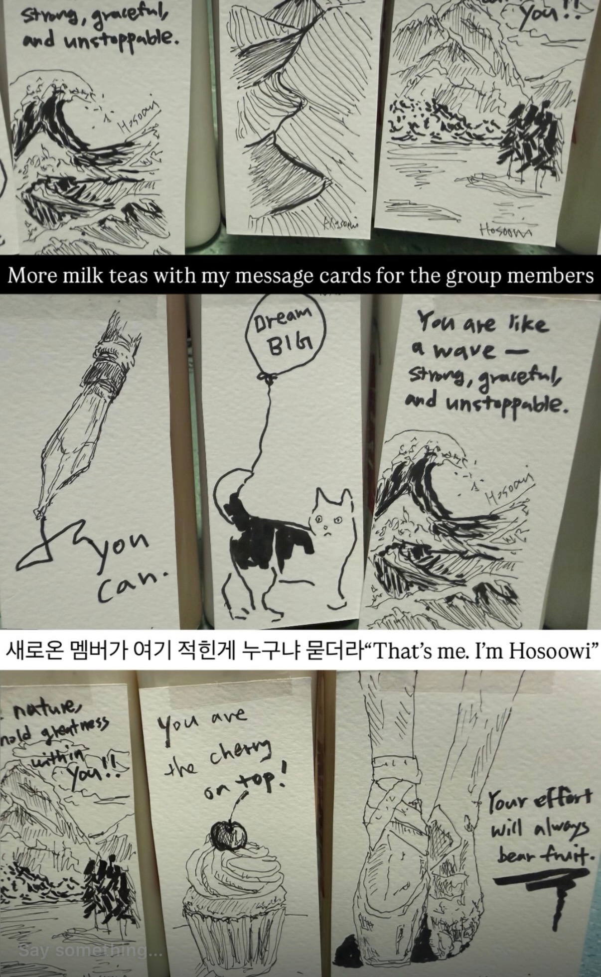 13개가 모두 다른 그림, 다른 메시지였다. 4가지 맛의 밀크티였는데 다들 맛보다는 나의 그림카드를 바탕으로 밀크티를 골라갔다. 그러고는 밀크티는 마시고, 밀크티에 붙어있는 그림카드를 떼어내서 책상에 붙여놓더라. 주변을 둘러보니 모두들 책상에 내가 준 그림카드가 약속한 것 마냥 붙어있었다. 그렇게 소중히 여겨주는 게 고마웠다.