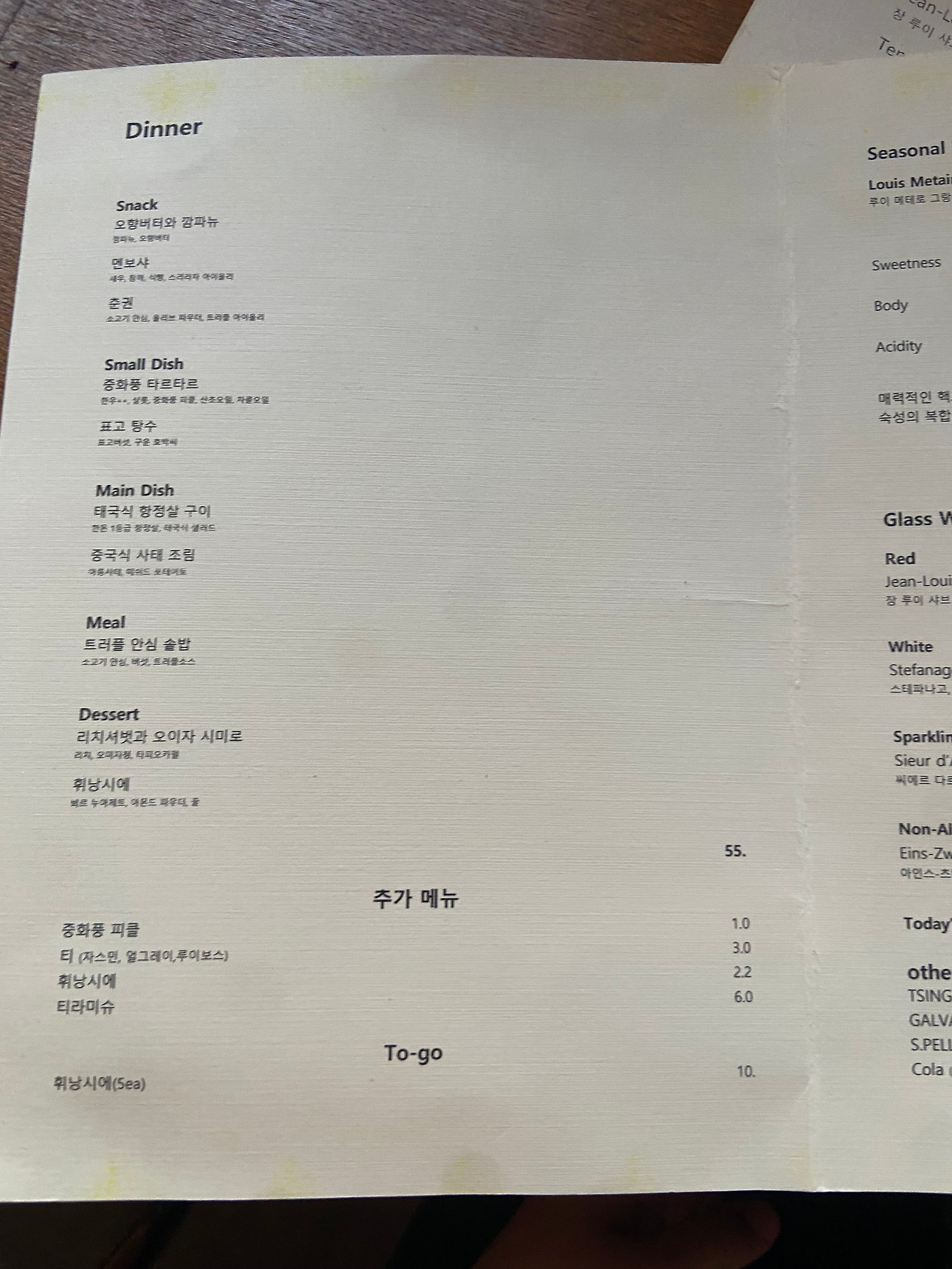 식사를 마치고, 식사를 하며 혼자 이런 저런 맛을 기록으로 남긴 휴대폰 메모를 다시 한번 슥 내려보았다. 제법 적어간 내용이 많았다. 모든 메뉴가 다 내 취향이었다고 할 수는 없었다. 하지만 5만원 대의 가격에 이정도로 다양한 음식으로, 나름의 식당이 고민하여 짠 코스를 즐길 수 있는 건 아주 큰 메리트같았다. 맛없는 메뉴가 있었던 것도 아니고, 제법 재밌고 흥미로운 식사였기에 - 다른 메뉴는 어떨까 궁금했다.