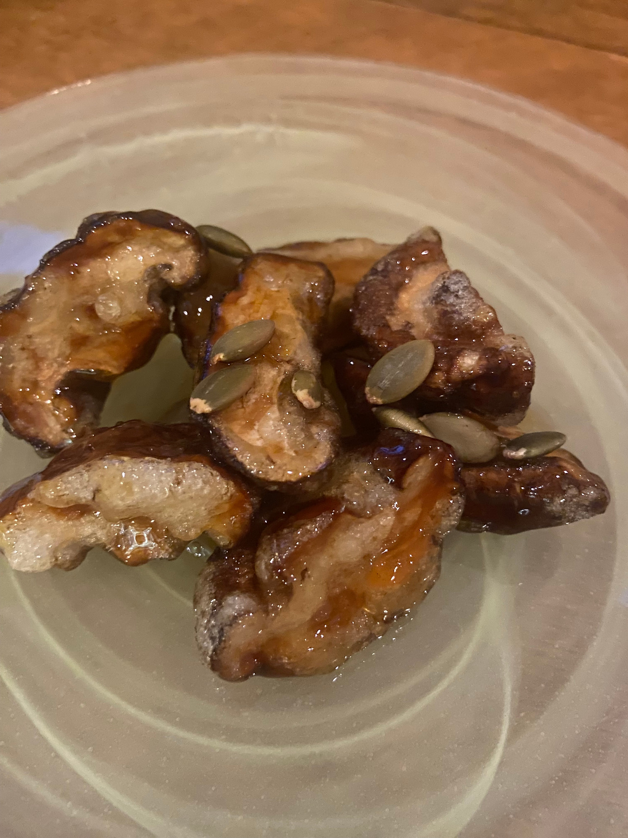 다음으로 표고탕수가 나왔다. 이건 어딘가, 한국 사찰요리 느낌이 났다. 표고버슷을 겉은 바삭하고 안은 쫄깃하게 튀겨내고 탕수육소스에 버무리고 구운 호박씨를 곁들였다고 했다. 비건이구나-라 생각했다. 겉은 바삭하게-라고 설명을 들었지만, 사실 바삭하다고 표현할 정도의 바삭함은 아니었다. 그러나 튀김으로 표고버섯의 표면의 경계면이 한층 생긴듯한 느낌은 있었다. 또한 튀김덕분에 소스가 더 잘 묻을 게 분명했다. 씹을 수록 표고버섯의 탱글함과 쫄깃함이 좋았다. 질긴게 아니라 탱글하게 탄력있는 식감이었다. 쫄깃함이 생표고가 아닌 말린 표고를 불려서 쓰지 않았을까하는 생각이 들었다. 식감을 위해서 말이다.