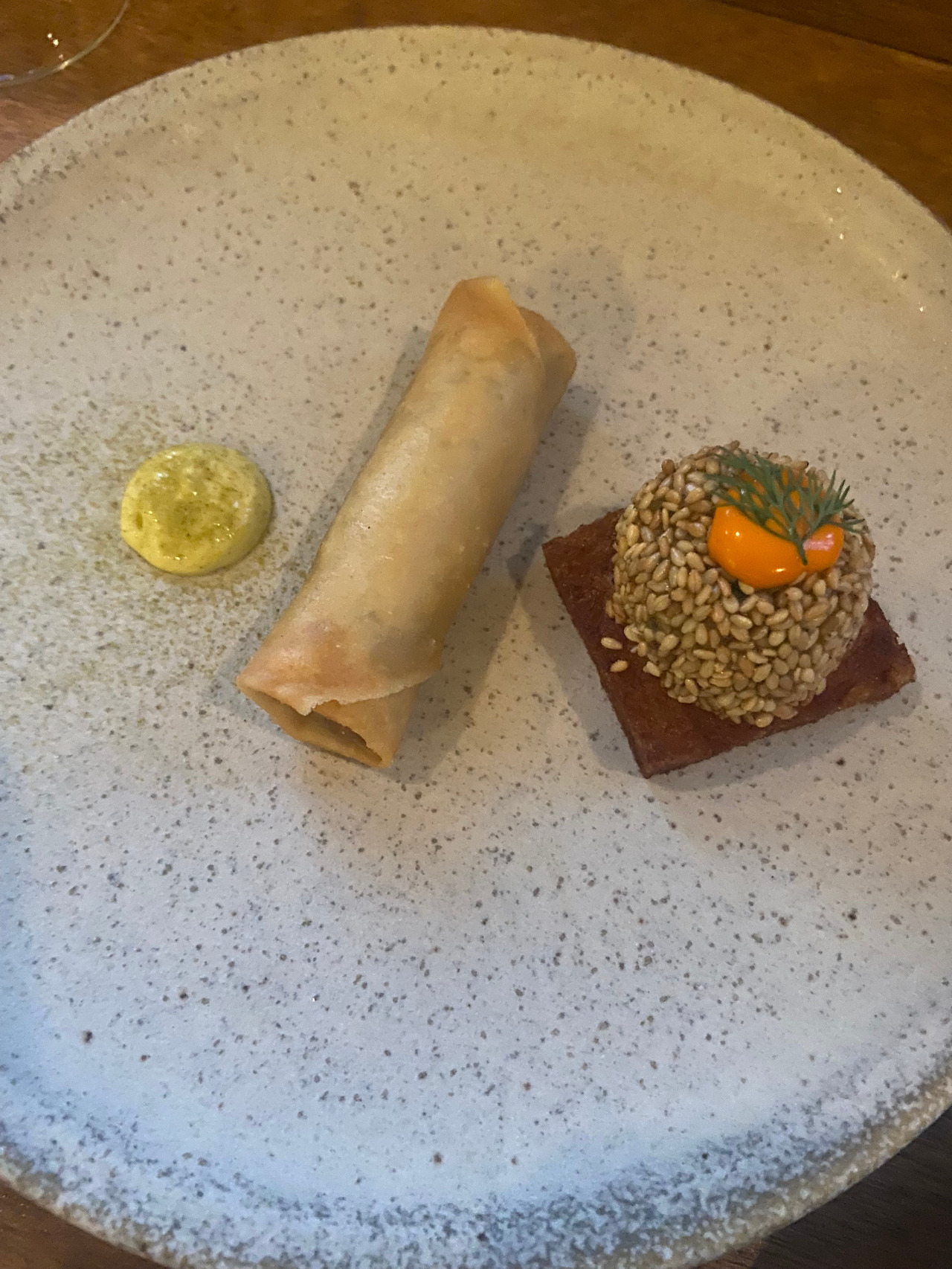 그 다음 한입거리의 멘보샤와 춘권이 한 접시에 담아내어 나왔다. 서버분은 매우 친절하게, 매번 메뉴들을 자세히 설명해주었다. 멘보샤를 조금은 다르게 해석해서 오픈 멘보샤로 절반은 참깨로 덮었다고 했다. 튀긴빵에 새우살을 깨로 감싸고, 스리라차 아이올리 소스에 딜. 손으로 들고 베어물어 보니, 깨의 고소함이 예상보다 강하게 다가와서- 새우의 은은한 단맛을 죽이는 게 아닌가 싶었다. 새우살은 탱탱하고 탄력있어서 부드럽기보다는 탄력있는 식감이었다. 참깨로 고소함을 주었기에 조금은 포인트를 주기위해 스리라차 아이올리를 선택한 듯 했다.