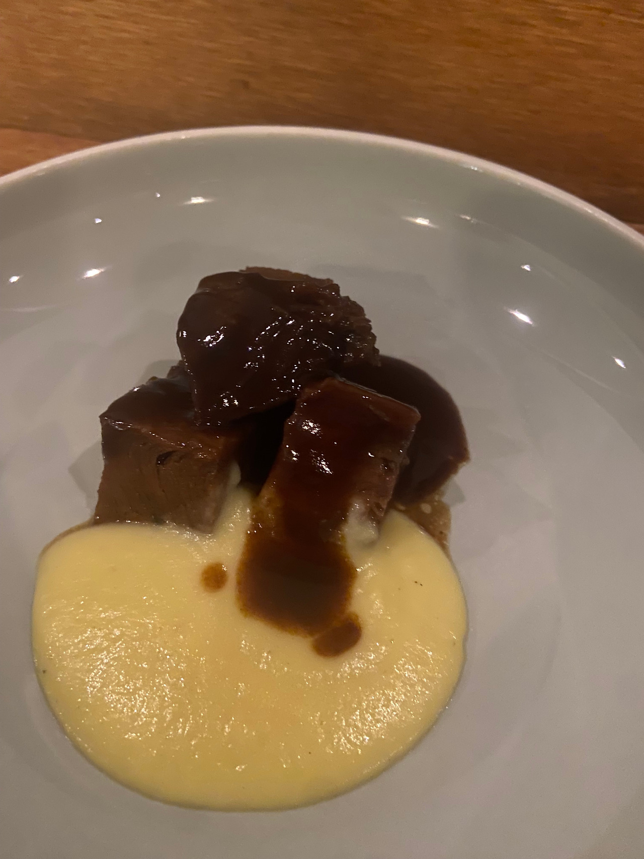 다음으로 또 다른 고기요리로 이번에 소고기가 나왔다. 중국 오향장육과 프랑스 비프 뷔르기뇽을 접목한 사태조림이라 했다. 간장 닭육수에 중국 무슨 소스로 조림을 했다고 들었는데 기억이 나지 않는다. 매쉬드 포테이토에는 넛맥과 버터를 넣었다고 했다. 고기로 감자를 감싸 먹으라 하더라. 먼저 고기를 먹어본다 식감은 비프 뷔르기뇽이다. 그런데 맛은 오향장육이다. 설명한 대로- 즉 의도한 대로의 요리를 만든 모양이다. 맛이 없는 것은 아니지만, 오리지널의 오향장육이나 비프 뷔르기뇽의 개별적인 요리들이 더 나은 듯 했다. 하지만 맛없는 것은 아니니, 이런 조합도 재밌게 먹을 수 있다. 고기만 먹으면 오향장육스러운 향이 강한데, 매쉬드 포테이토와 먹게되면 안에 들어간 버터 때문이진 한결 부드러워지면서 그 향이 누구러진다. 그 조합이 좋더라.