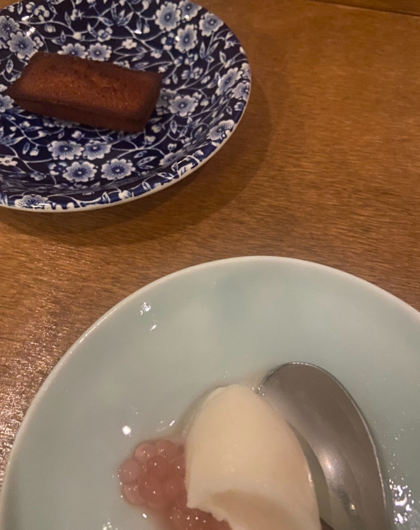 고기있는 솥밥 같은 것으로 기름진 느낌으로 입을 마무리하면 영 개운하지가 않다. 그러니, 배가 불러도 디저트는 먹어야 하고, 먹을 수 있다. 디저트를 먹어야 식사가 끝난 기분이다. 이전에는 메뉴들을 하나를 마치면 다른 접시를 가져다 주었는데, 디저트는 동시에 내다주었다. 리치고량주 샤벳에 타피오카 펄에 오미자청을 뿌렸다고 했다. 그리고 휘낭시에는 차갑게 준비했는데 처음엔 차갑지만 금방 괜찮아질거라 말했다.