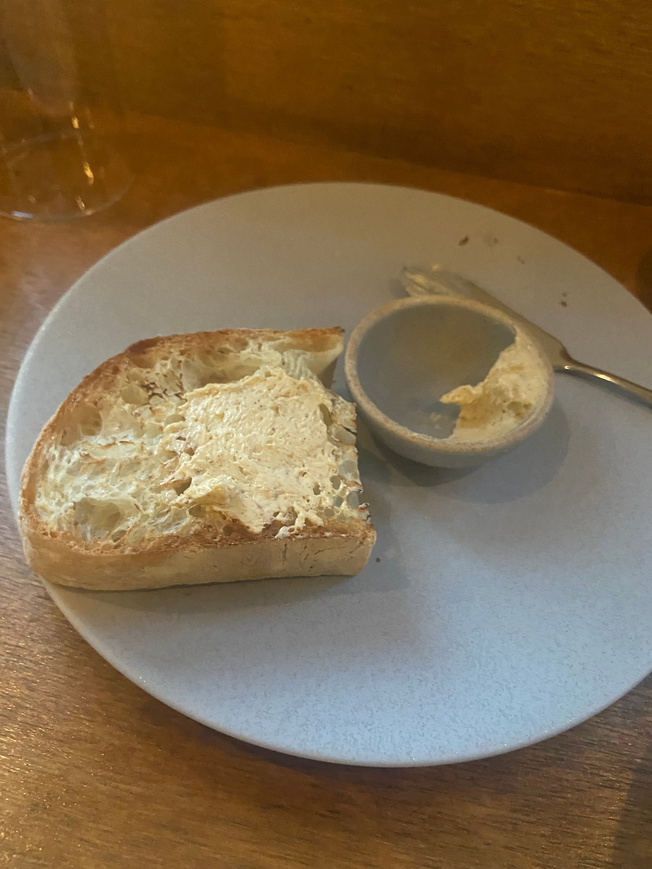 먼저 숯에 구운 깜빠뉴 빵 한조각에 버터에 갈색설탕과 오향을 섞어 내주었다. 사진찍는 것을 깜빡하고, 버터를 바른 후에야 뒤늦게 기록하였다. 빵에 발라먹기 좋게 실온으로 준비된 버터는 크리미하게 구워서 살짝 바삭해진 빵에 잘 발렸다. 버터의 부드러운 크리미한 느낌 아래로 단맛이 깔리며 그 위에 오향의 향이 입과 코를 자극한다. 약간 시나몬스러운 따뜻한 계열의 향이라서인지 부드러운 크림과 함께 잘 섞이는 듯했다. 오향에 대한 거부감은 없었지만, 시작에 단맛이 있다는 게 조금 취향이 아니었다.