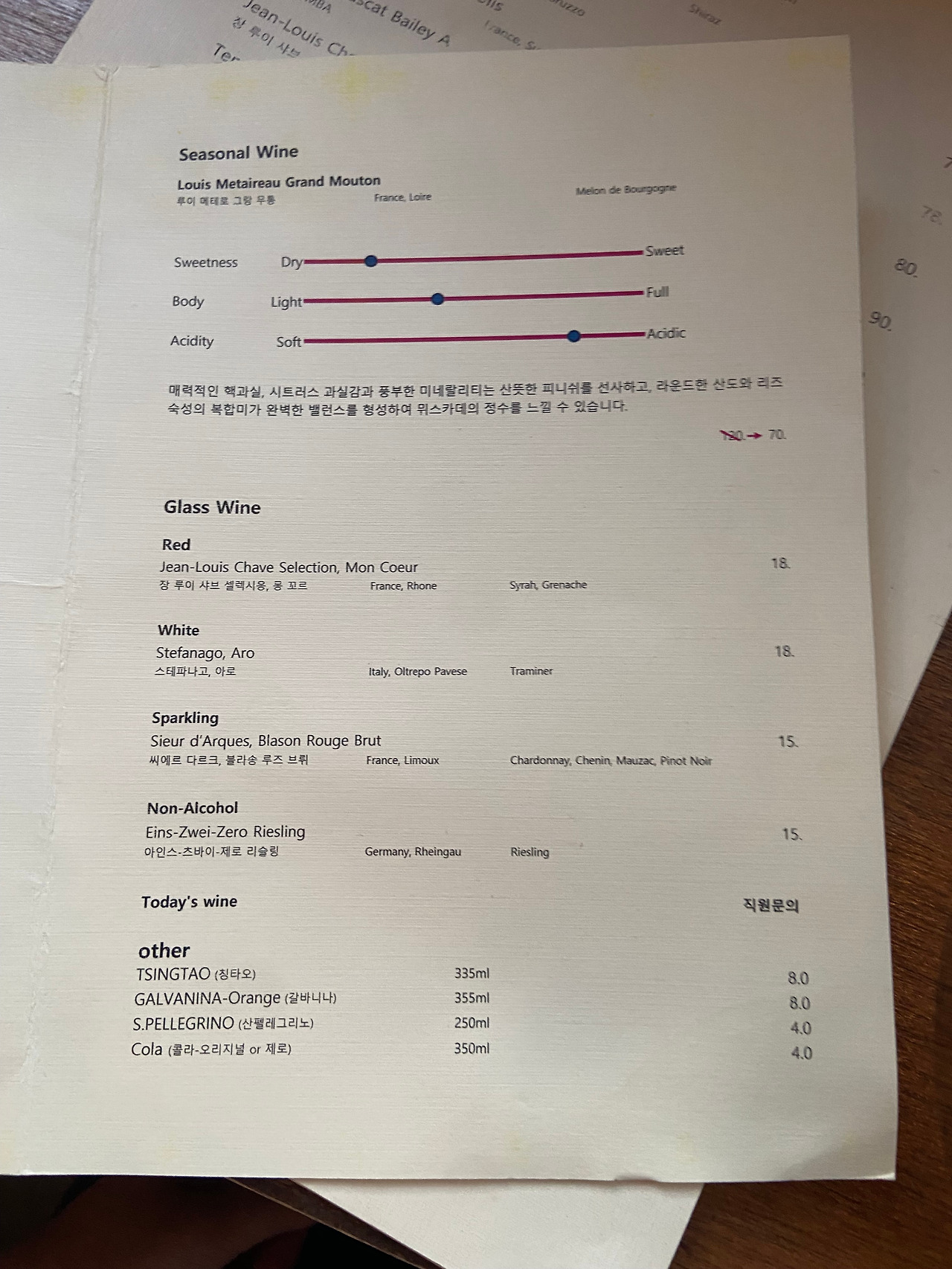 가게가 2층에 있는데, 계단이 조금 가파른 느낌이었고- 이런 계단으로 접근성이 용이하지 않은 곳을 좋아하진 않는다. 특히나 와인이나 술을 곁들이는 식당들일 수록- 말이다. 식당을 들어가니 생각보다 더 아담한 가게지만, 주방과 홀에서 일하는 분들을 합치면 서너명은 되어보였다. 크기에 비해 인원이 많구나 싶었다. 예약해두었기에 자리로 바로 안내받았다. 요리가 타임별로 시작되는 모양이었다. 예약인 7시보다 조금 일찍 도착했지만, 7시까지 기다려야했다. 그동안 물을 가져다주고 메뉴 설명을 해주었다. 메뉴는 코스 하나라고 했다.
