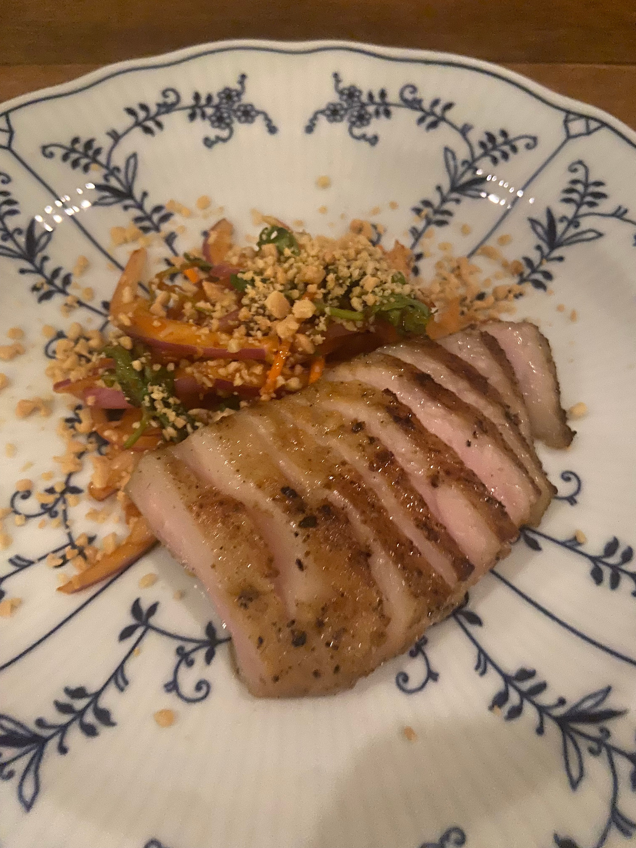 일등급 한돈 항정살 구이와 태국식 샐러드를 곁들였다고 했다. 피쉬소스, 라임, 코코넛 설탕을 섞어 만든 소스로, 태국의 원초적 맵고달고짜고단 맛이 모두 섞여있으니 양을 조절해서 고기와 함께 먹으라 했다. 나는 개인적으로, 내가 조절해 먹기보다, 쉐프나 요리사분들이 베스트 조합과 베스트 양으로 알려주는 걸 좋아한다. 취향껏 조절하라는 건 뭐랄까, 조금은 손님에게 책임을 떠넘기는 느낌이 든다고나 할까?