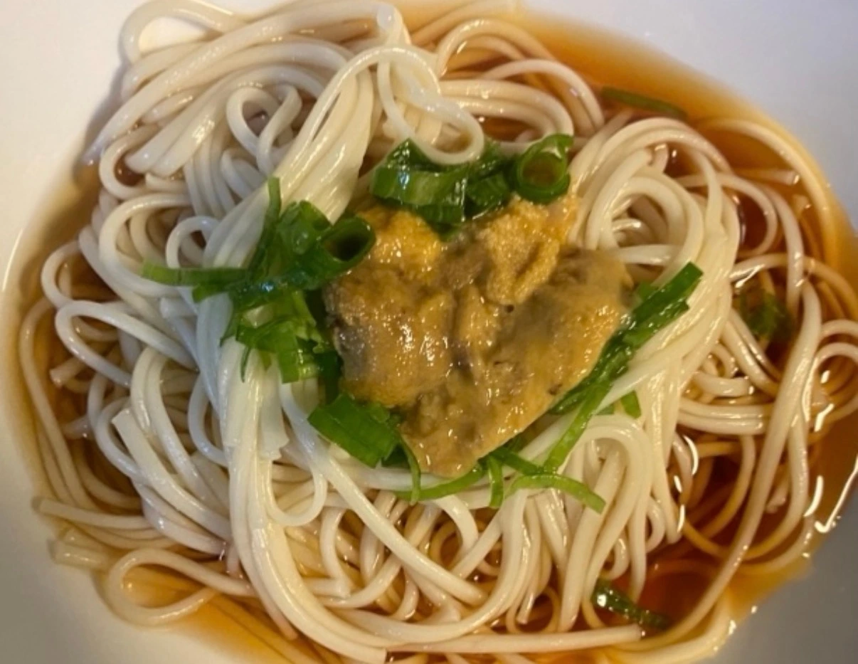 원래는 메밀소바를 이용하려 했으나, 배송이 지연되었다. 마침 일본에서 맛있어서 사 왔던 소면이 있었다. 한 식당에서 맛보고 너무 맛있어서 사 왔던 소면이었다. 탱글함이 지금까지 맛보았던 그 어떤 소면보다 맛있었다. 그렇기에, 소면을 삶고, 쯔유에 담근 후- 고명으로 파를 조금 얹고 그 위에 신선한 우니를 얹었다. 두 번째 메뉴도 완성이었다.