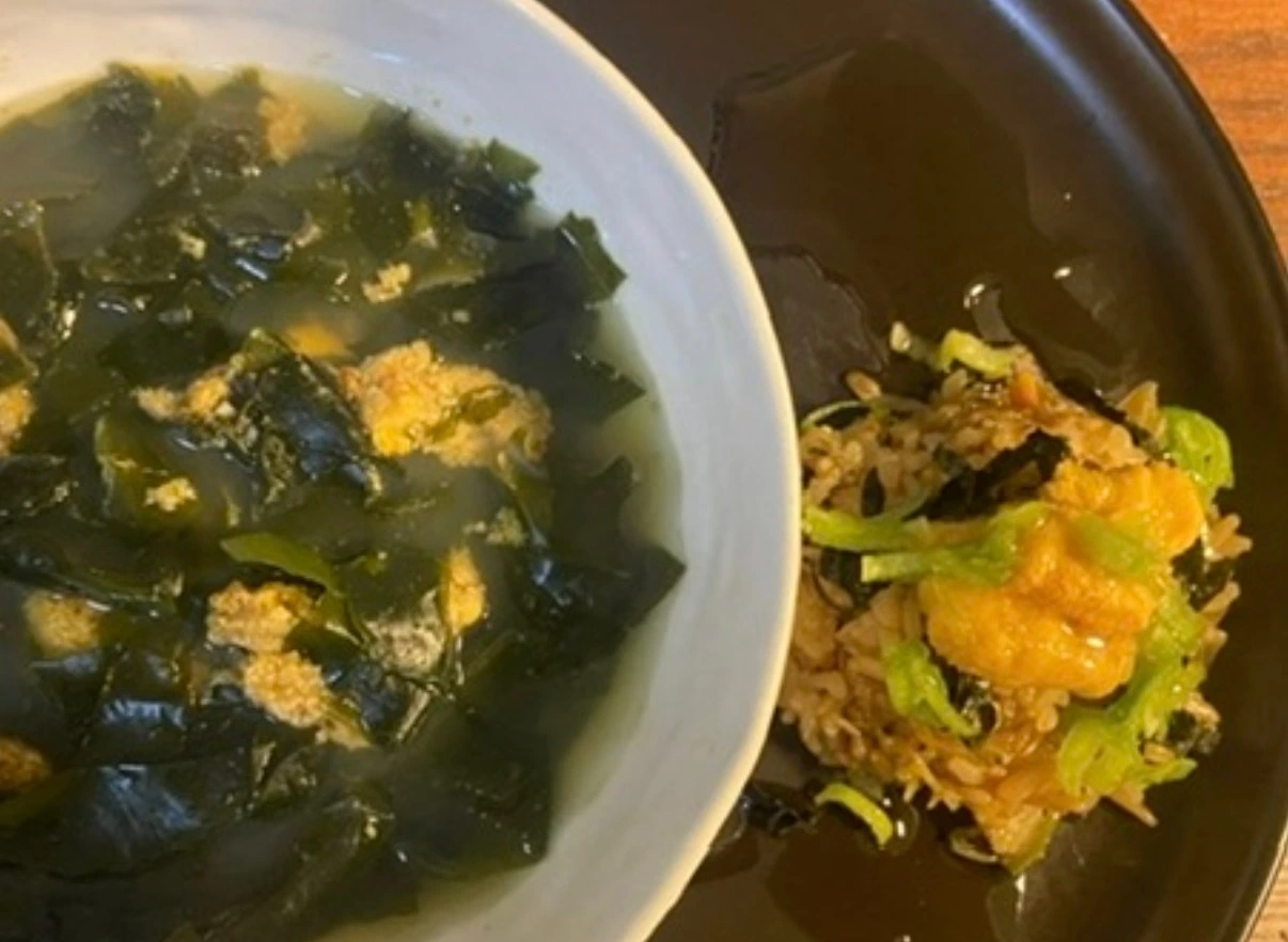 미역국에 밥을 곁들였다. 마침 그날 아침에 만들었던 우엉을 넣은 주먹밥이 있었다. 간장 양념으로 일본에서 먹던 삼각김밥 맛을 흉내 낸 것이었는데, 어쩐지 성게와 어울릴 것 같았다. 미역국에 밥을 곁들여 첫 번째 메뉴가 완성되었다.