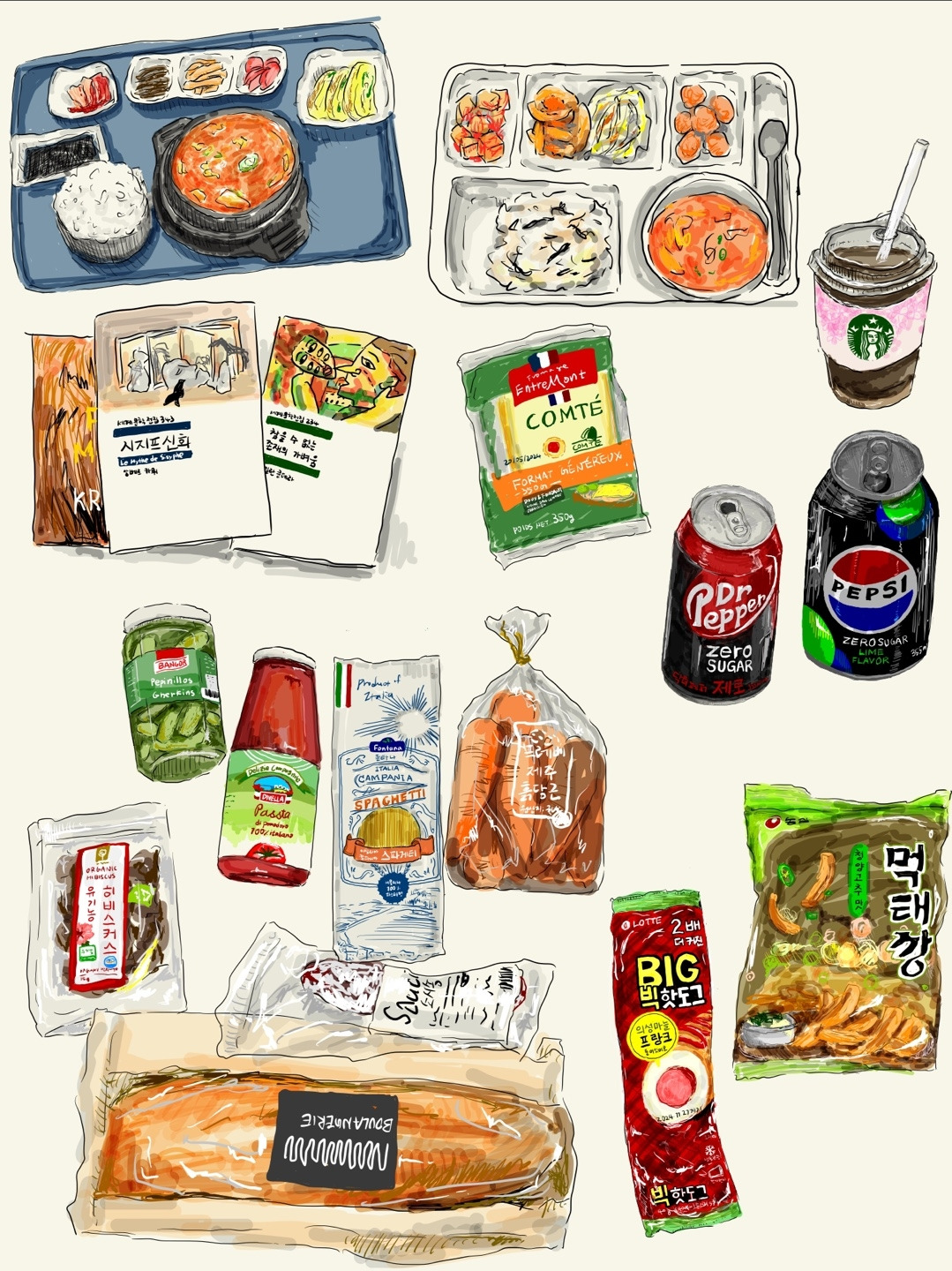 2016년의 어느 날이었다. 그 당시에 해외 브이리그 유튜버 사이에서 유행이던 것이 바로 "What I ate in a week"였다. 자신이 일주일간 먹은 것들을 영상으로 기록한 것이었는데, 먹는 것도, 요리하는 것도 좋아하는 나는 그런 영상이 너무 재밌었다. 하지만 나의 일상 속 식단을 영상으로 찍거나 하는 것은 귀찮았다. 해보진 않았지만 영상 편집에 상당한 시간이 소요되고 힘들다고는 전해 들어 알고 있었다. 그래서 어느 날 내가 먹은 것을 펜으로 끄적였다. 그리고 집 안 어딘가 뒤져 물감으로 가볍게 색칠을 했더랬다. 보통은 나의 그림을 누군가에게 보이진 않는 편인데, 그날은 왜 그랬는지 모르겠지만- 제일 친한 친구에게 내 그림을 사진으로 찍어 보냈었다. 어쩌면, 스스로 제법 만족한 그림이었는지도 모르겠다. 친구는 느낌 있다며 칭찬해 주었고, 계속 그려보라며 나를 북돋아주었다. 기분이 좋았고, 재미도 있었기에 계속 하자 다짐하고는 그렇게 한동안 내가 먹는 것들을 그려나갔다. 2025년까지 이어 온 나의 취미- 그림 그리기의 시작이었다.