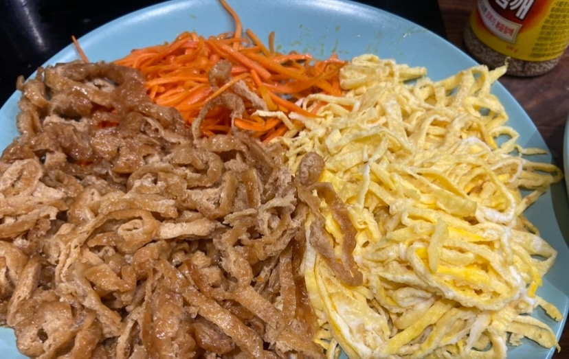 세 가지 재료는 김밥 속 재료를 말한다. (설마 김과 밥도 재료라고 하지는 말자.) 먼저 고슬고슬한 밥이 필요하다. 김밥과 김초밥의 차이. 이곳에 있는 외국인에게 김밥에 대해 설명할 때 나는 종종 이렇게 말한다. "일본의 김초밥 (sushi)에는 식초를 넣고 한국의 김밥(Kimbab)에는 참기름을 넣는다. 둘은 완전히 다른 맛이다." 김밥을 만드는 것이니, 밥에 소금으로 간을 하고, 참기름을 넣어 고소함을 추가하자. 깨가 있다면 깨도 넣어 고소함을 배로 만들어주자. 밥이 준비됐다. 속 재료를 준비하자. 당근을 채 썰어 기름에 볶아주며 소금 간을 한다. 계란은 소금을 살짝 넣고, 지단을 만든 후, 채 썰어 잘게 준비해 준다. 마지막으로 오늘의 주인공 유부이다. 유부를 가늘게 썰어준다. 팬에 (유부에 이미 기름이 많으므로) 기름은 따로 두르지 않고, 간장과 설탕을 넣고, 물을 좀 부어준 후 유부를 넣고 졸여준다. 유부에 색이 스며들고 간이 들면 완성이다.