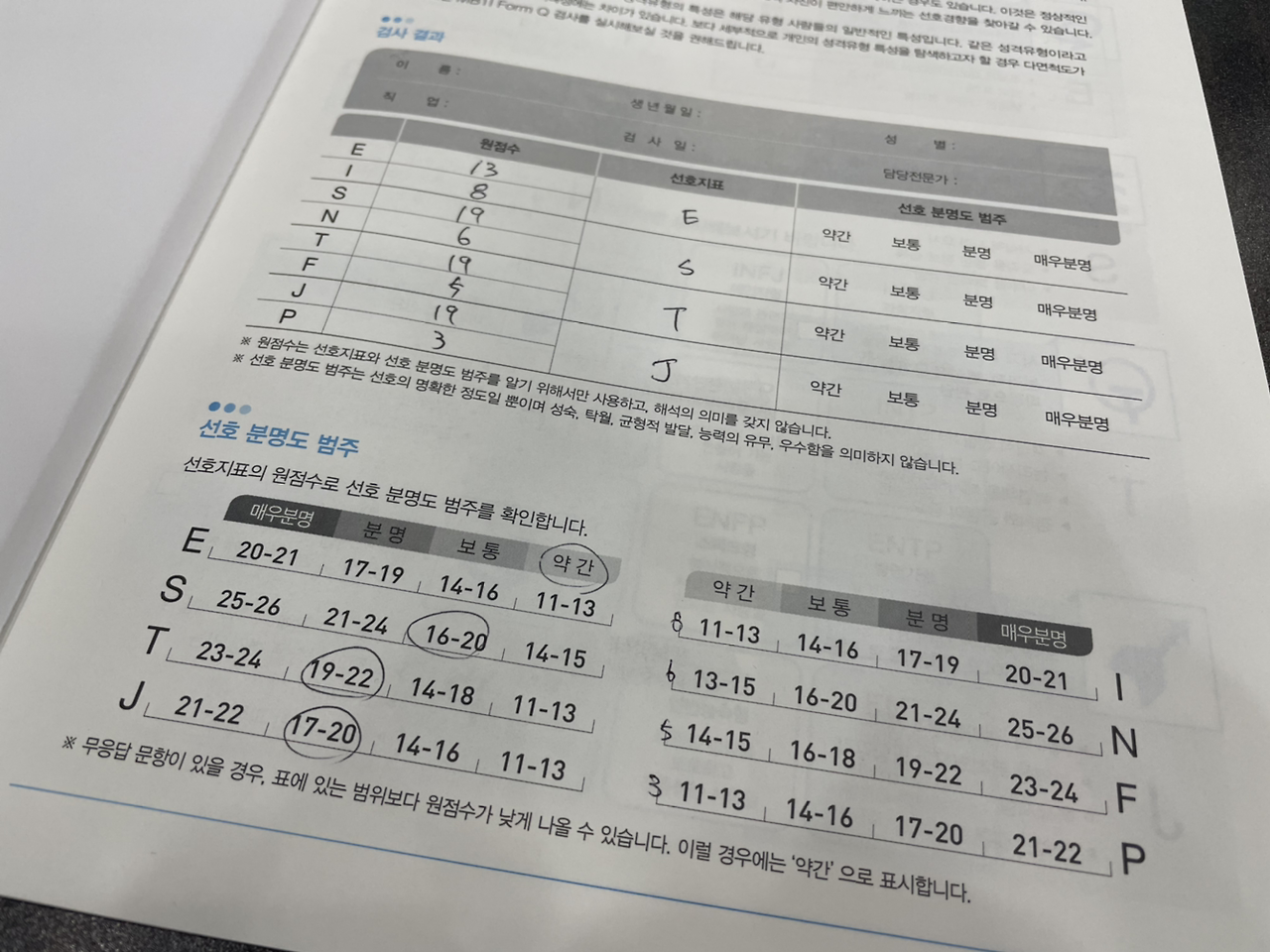 여하튼, 인터넷으로 매우 낮은 신뢰도를 가지고 하는 테스트가 아닌 정식 검사지로 MBTI 테스트를 할 기회가 생겼다. 위에도 언급했던 것처럼 아마 2002년에도 분명히 했던 기억은 있는데 그 당시에는 소위 '유행'이 아니었기 때문에 결괏값에 대한 기억이 전혀 없다.