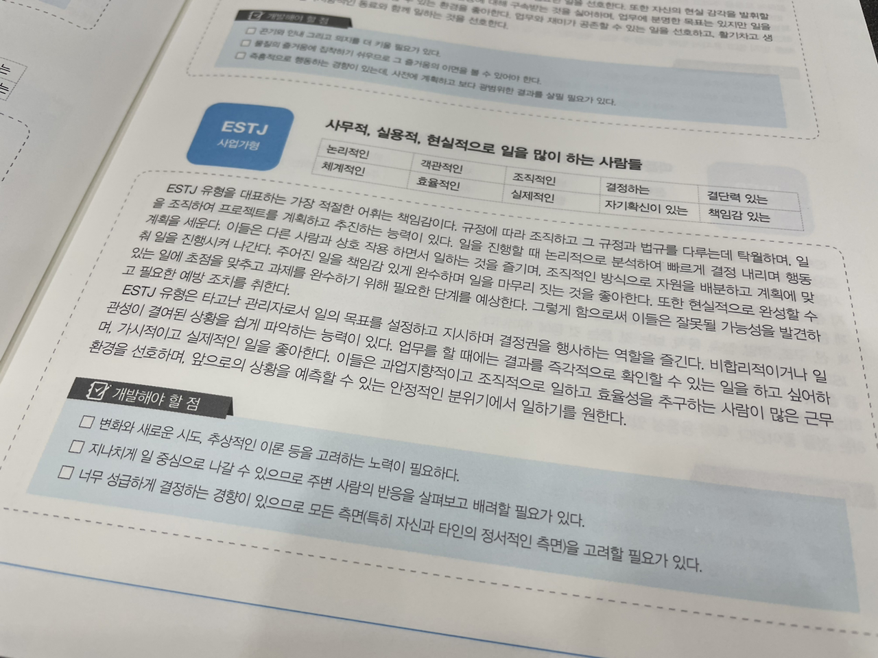 이렇게 따지고 보면 MBTI의 결과인 ESTJ와 비슷한 성향이 나왔다고 할 수 있겠다. 당연하지. 둘 다 검사하는 방법은 비슷했으니..