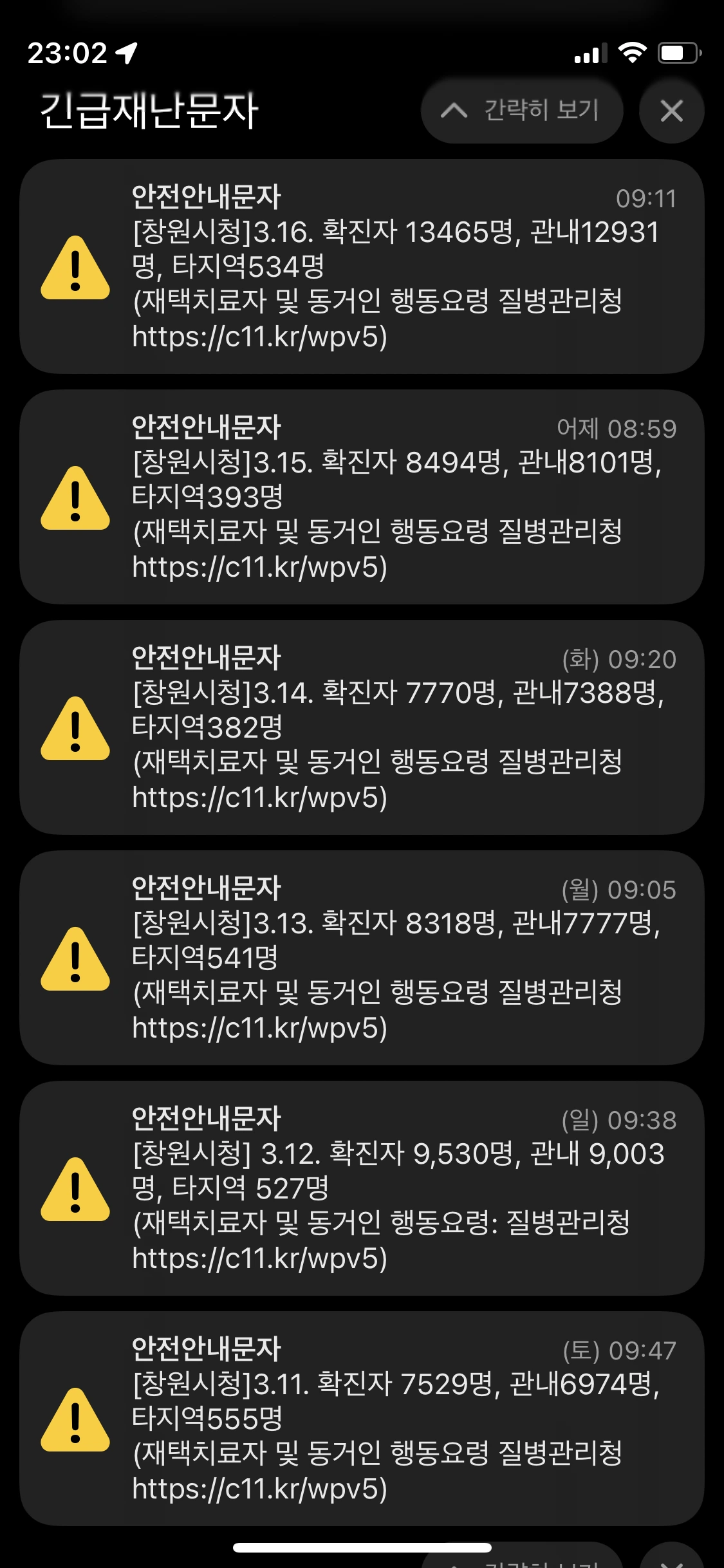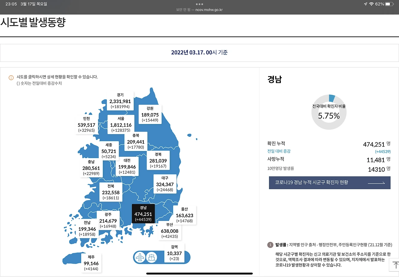 22.03.16. 전세계 신규 확진자의 1/4이 우리나라에서 나왔다고 한다. 신속항원검사도 확진자로 인정하면서 숫자가 갑자기 늘어난 건지, 방역 완화 조치와 함께 안일해진 마음가짐으로 인해서 늘어난 건지 알 수가 없다. 어쨌든 매우 심각한 상황이다.