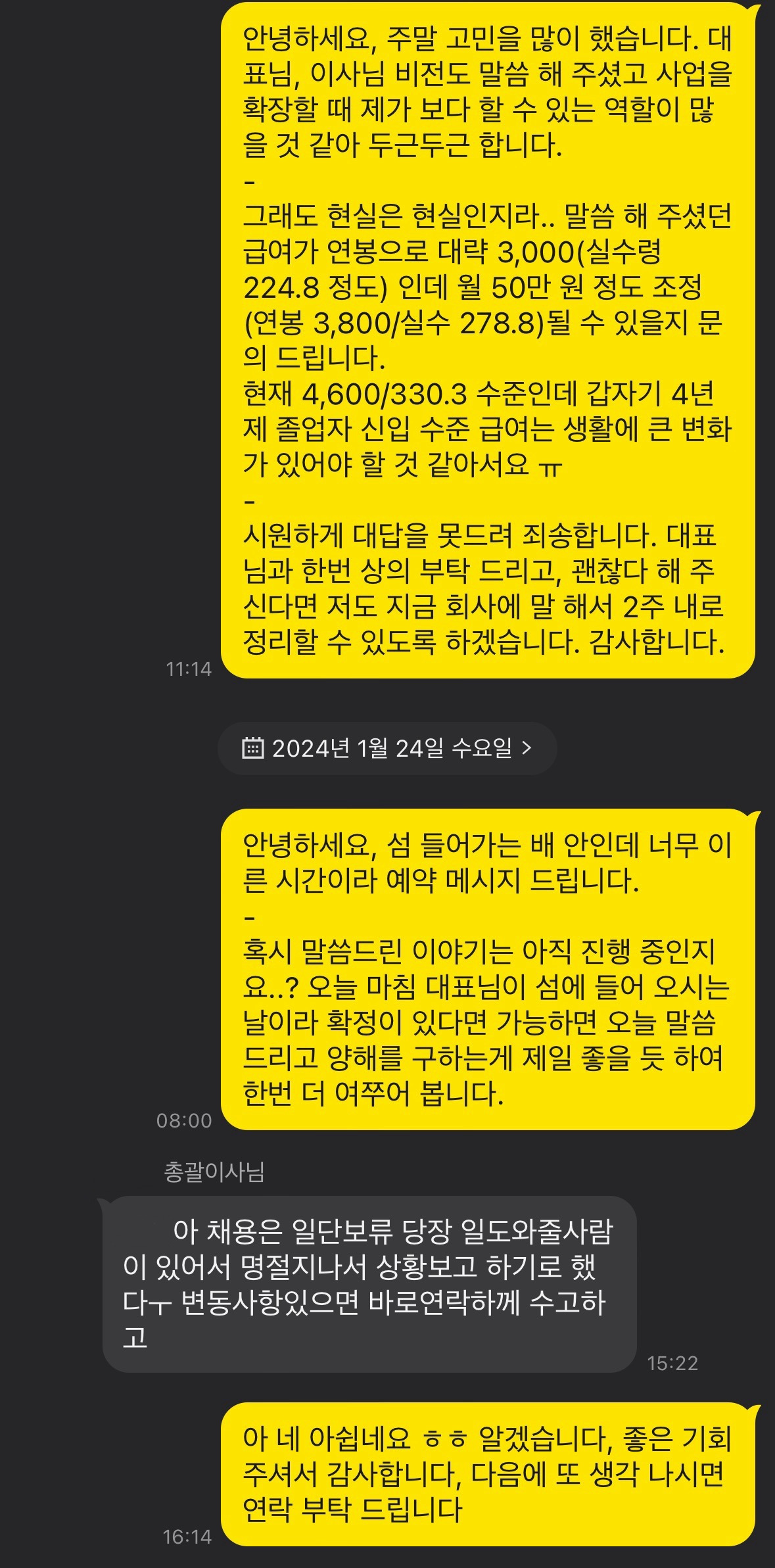 하여튼, 대답 없는걸 몇 번이나 먼저 연락 하는것도 자존심이 팍 상하고, 최초 급여를 어이없는 수준으로 책정한 것도 자존심이 팍 하고 상했다. 그래도 뭐.. 혼자 살고, 새로운 업무에 조금 설레서 어느정도 맞추어 지면 이직을 하고자 하는 마음이 더 커서 연락을 꾸준히 했는데..?