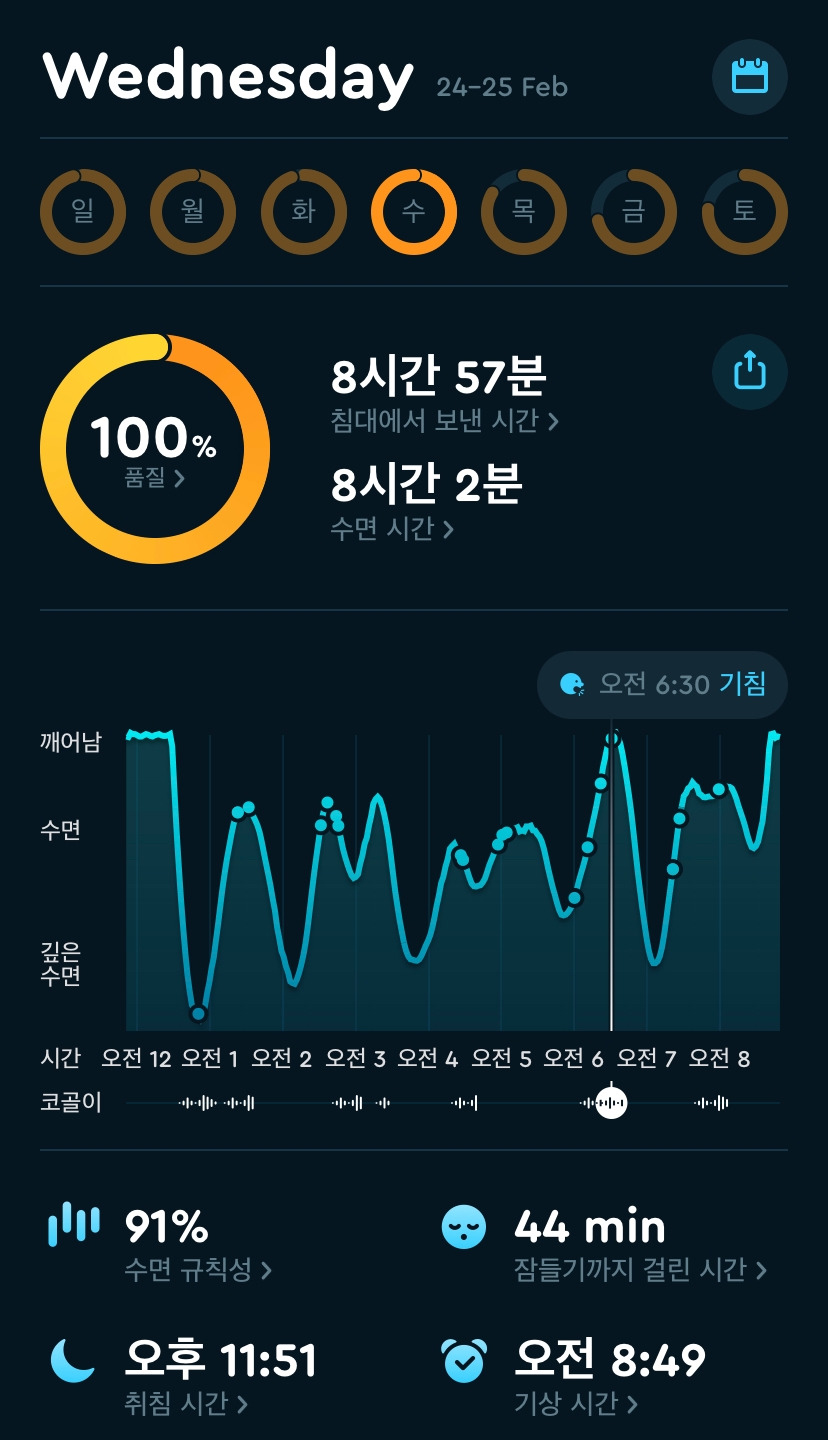 사실 앱 자체에 수면 습관을 개선하는 기능이 포함되어 있는 건 전혀 아니다. 다만 내 수면이 기록되고, 기록을 통해 어떻게 자고 있었는지 눈으로 확인하게 되니 잠들기까지의 과정에 자연스럽게 신경을 쓰게 됐다. 가급적 일찍 자야 하니까 저녁식사는 오후 6시 이전에 하고, 6시 이전에 식사를 할 수 없는 날에는 가능한 가볍게 먹는다. 늦은 시간에, 거하게 저녁을 먹으면 다음날 반드시 머리가 멍해지거나 눈 주변이 무거워지기 때문이다. 이 규칙을 잘 지키지 못한 날도, 예전처럼 새벽까지 휴대폰을 붙잡고 있었던 날도 있지만 이전과 비교하면 수면의 질이 월등히 높아진 것 같다. 수면 품질이 백 퍼센트를 달성하는 아침에는 얼마나 뿌듯한지! 그리고 아마 기분 탓일 가능성이 높겠지만, 낮 동안에도 예전만큼 화나 짜증이 자주 나지 않는다.
