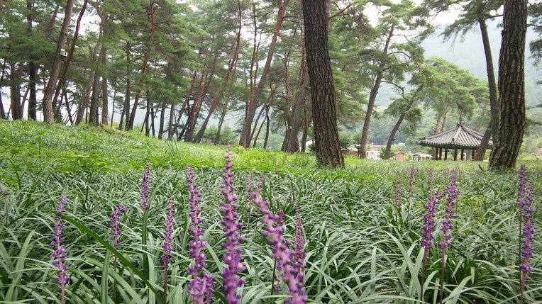 그 아래 보라색 꽃을 피우는 맥문동 군락...