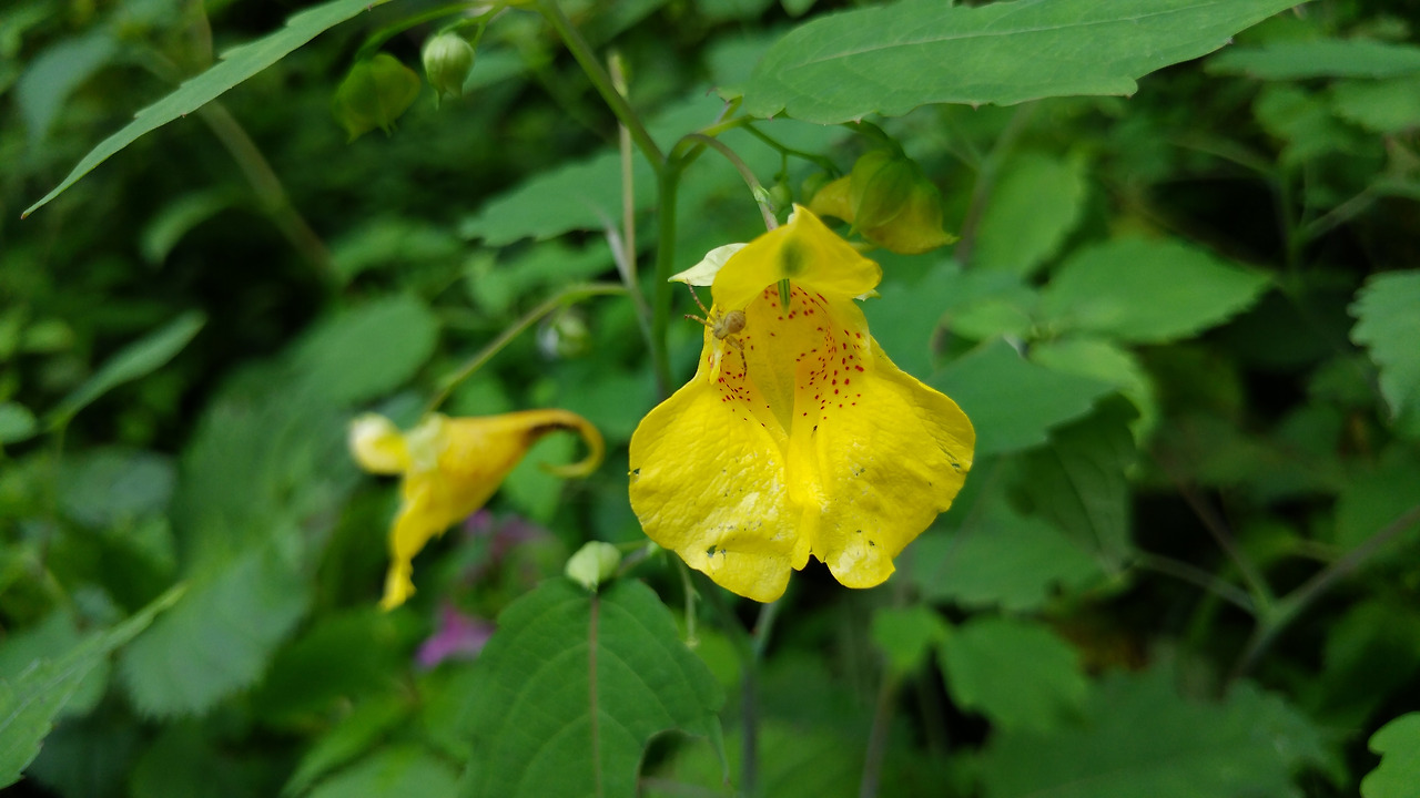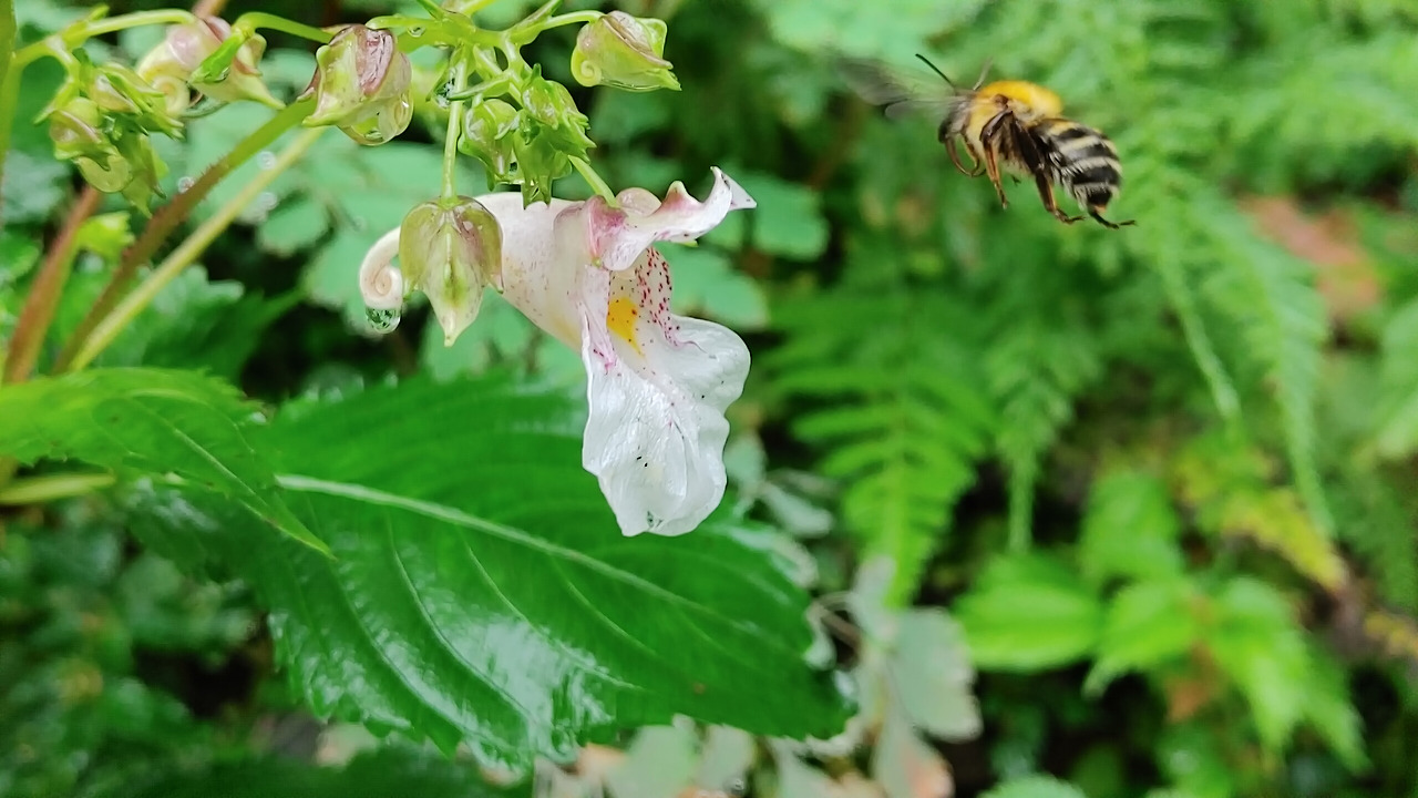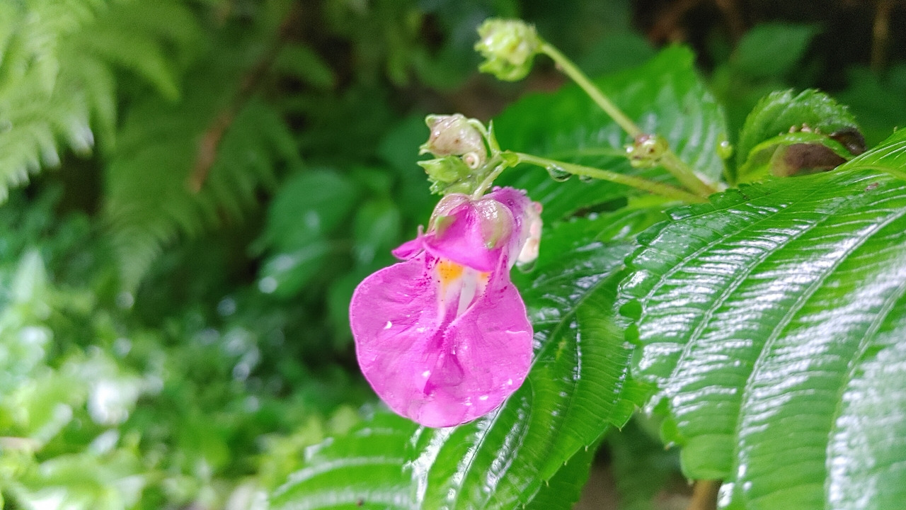 묘한 모양의 분홍, 노랑, 흰색의 물봉선 꽃