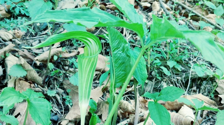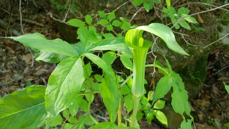 정성스펀 포에 둘러쌓인 코브라 모양의 꽃을 피우는 천남성