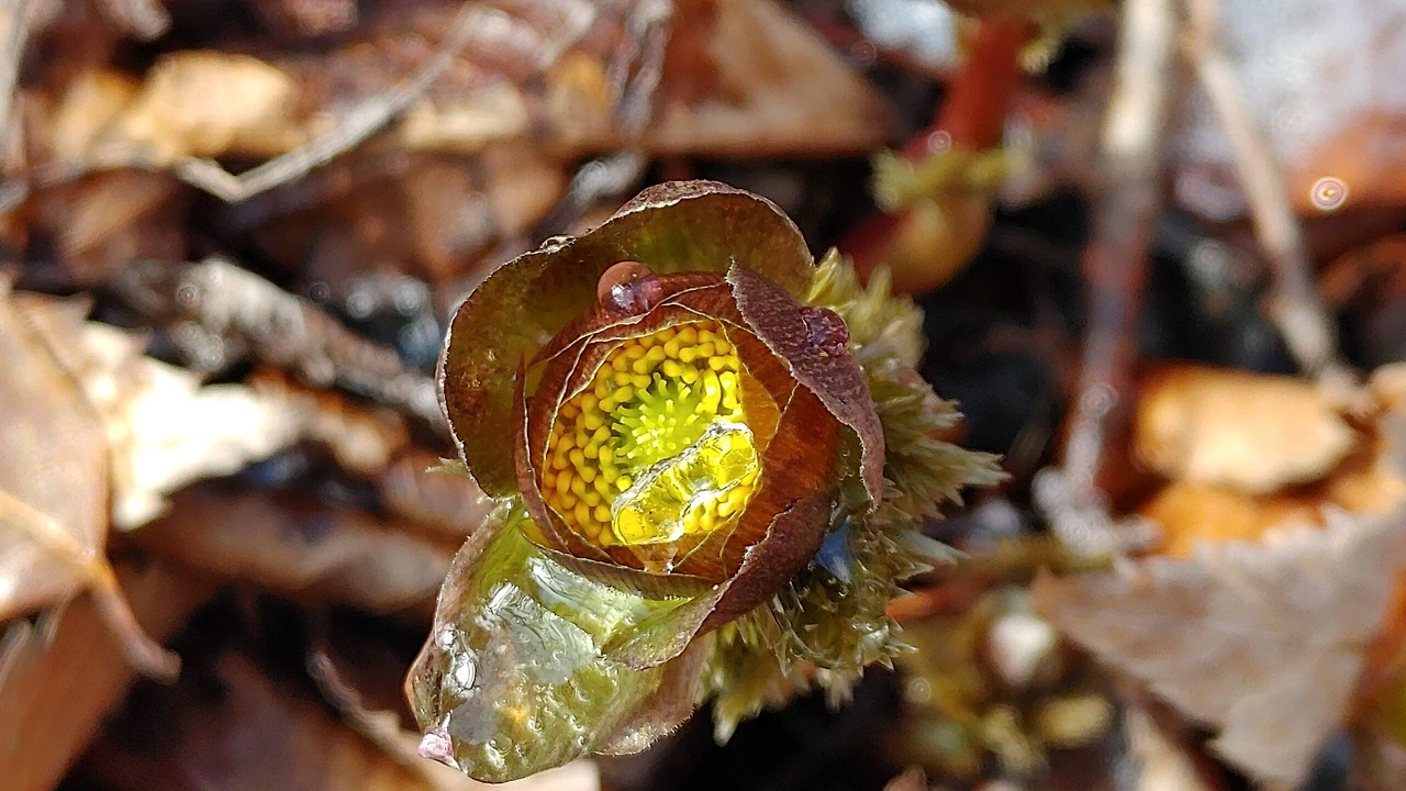 꽃빛깔이 황금빛, 아래 맺힌 눈녹은 물방울, 비언어적 소통으로 무엇을 말하려는 것일까요?