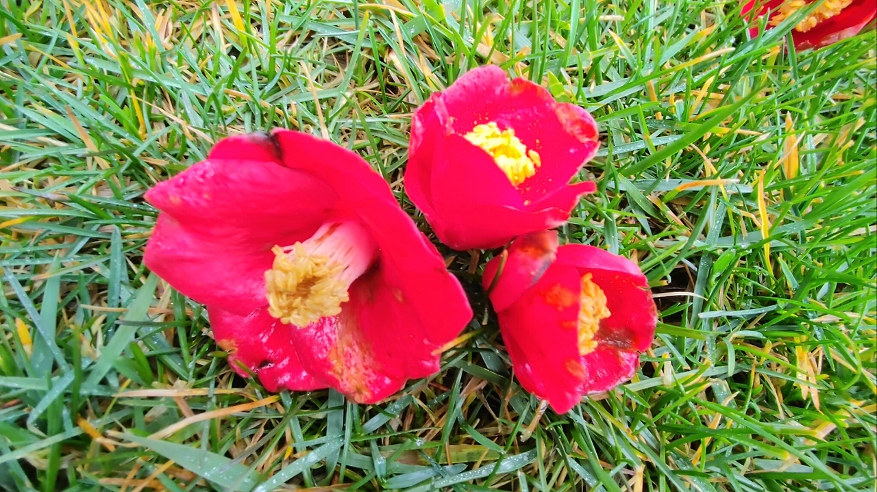 떨어져 내린 동백꽃 주워