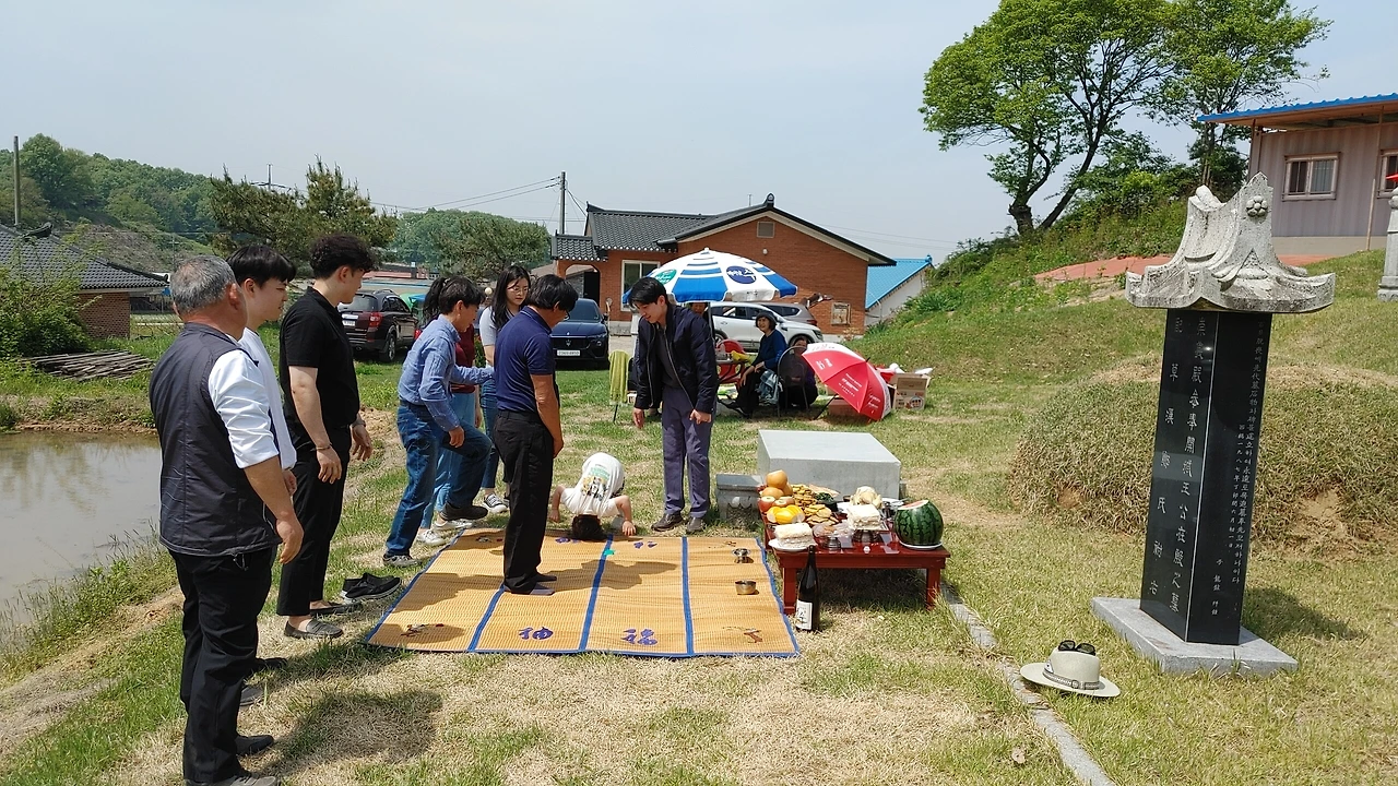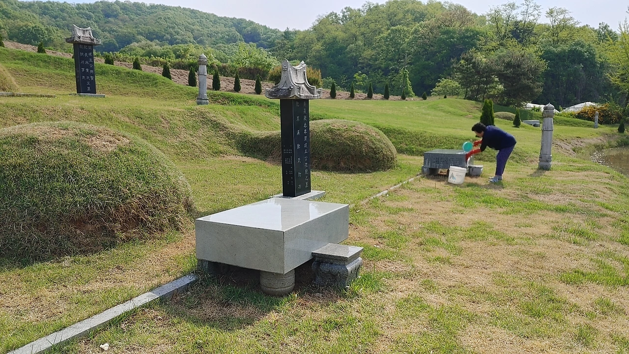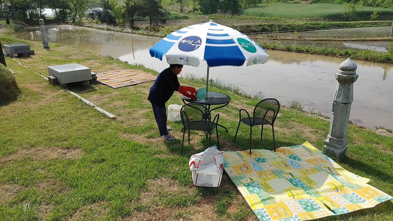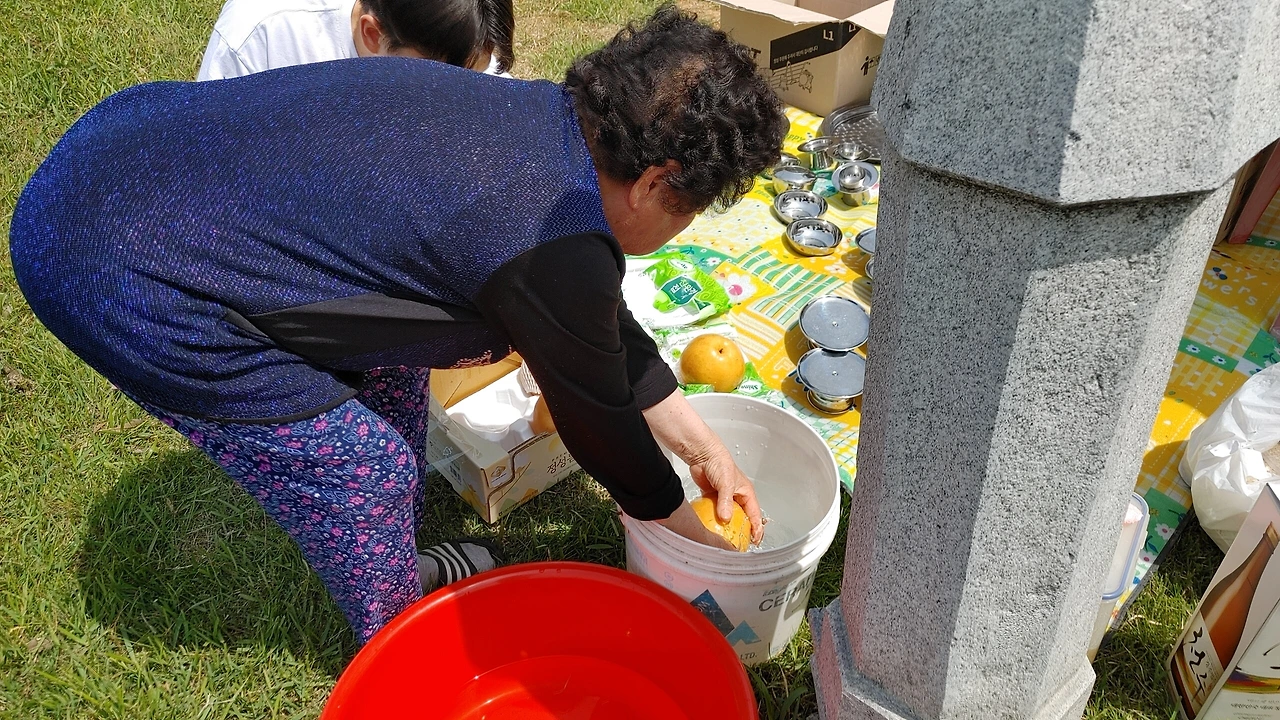 외할아버님 기일 맞아 찾아올 형제들 위해 상석을 닦으시는 어머니