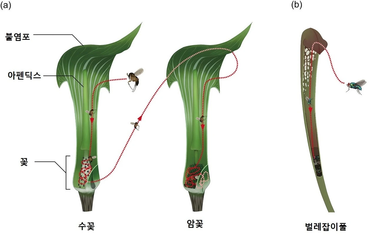 진짜 꽃은 꽃처럼 보이는 불염포 속 아래 있지요 - 출처: 애니멀피플(생태와 진화)