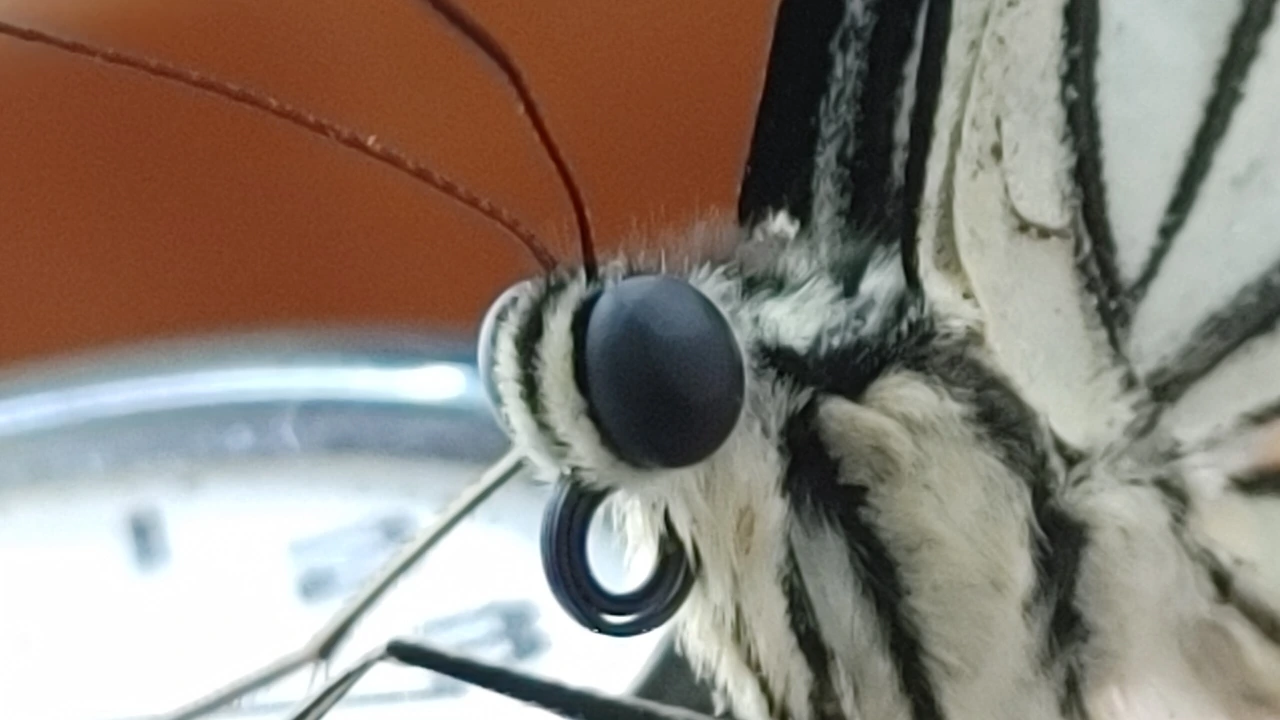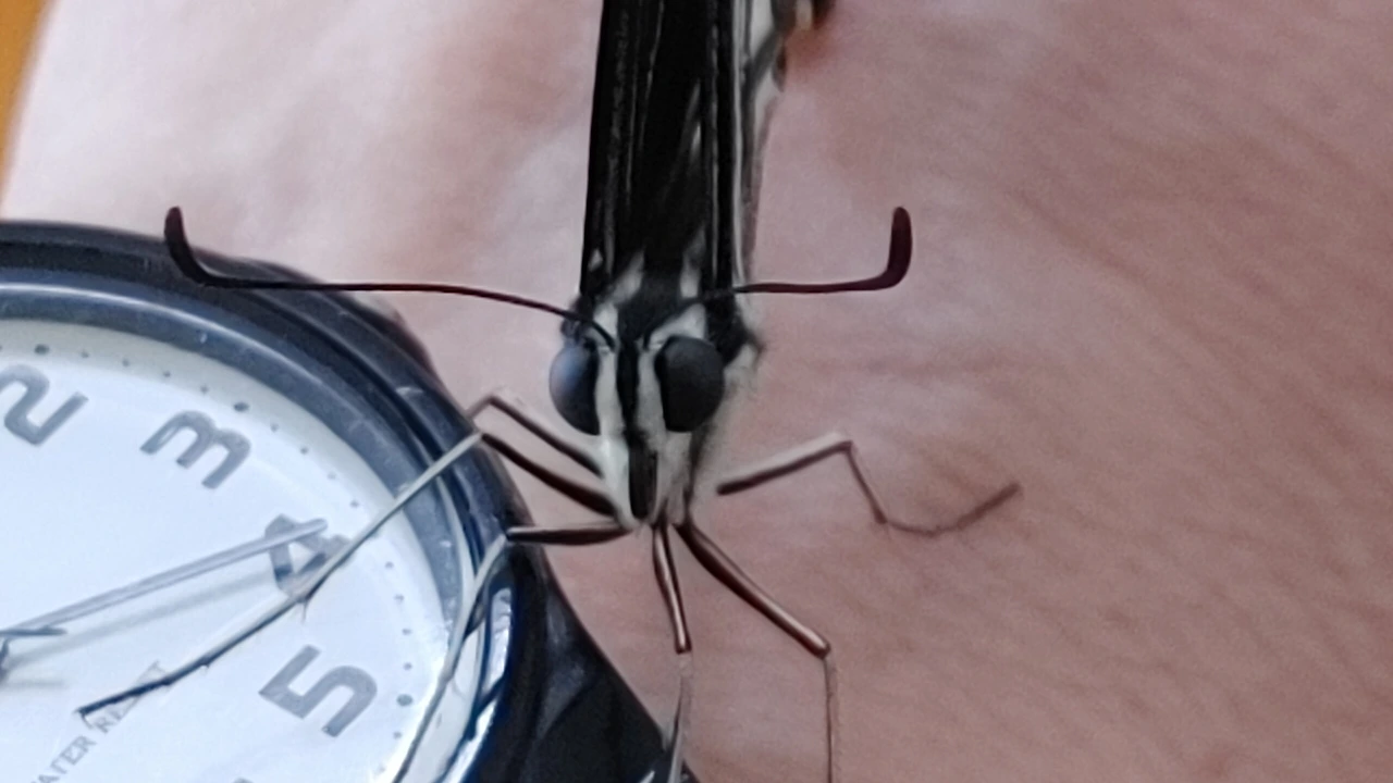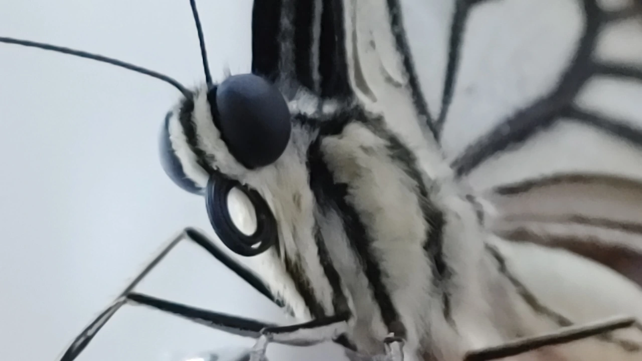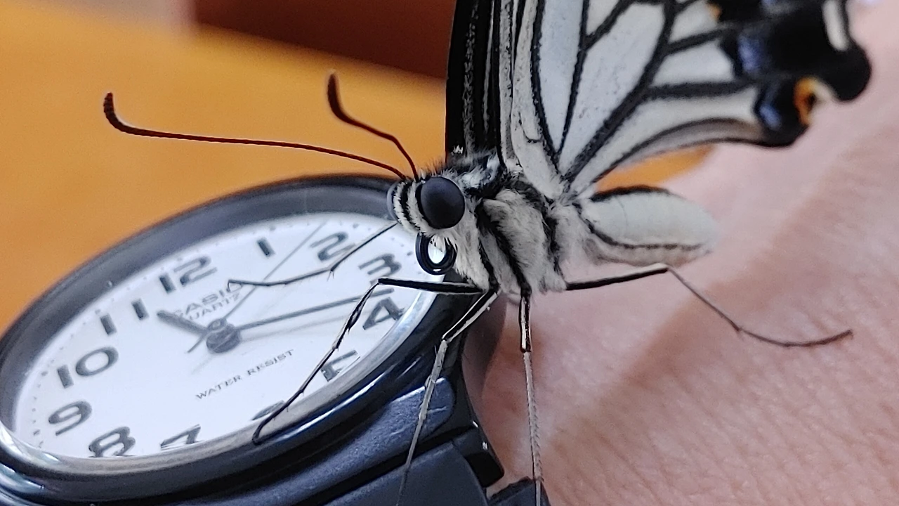 한여름 휴양림에 날아든 '산호랑나비', 제법 크고 아름다운 나비의 대명사 검은콩처럼 생긴 눈, 그 아래 동그란 것은 주둥이가 말린 것