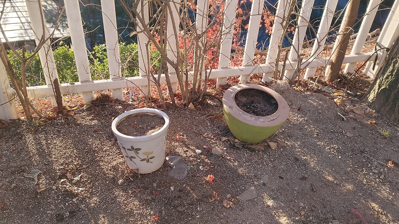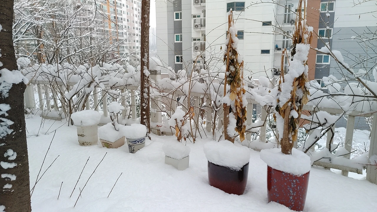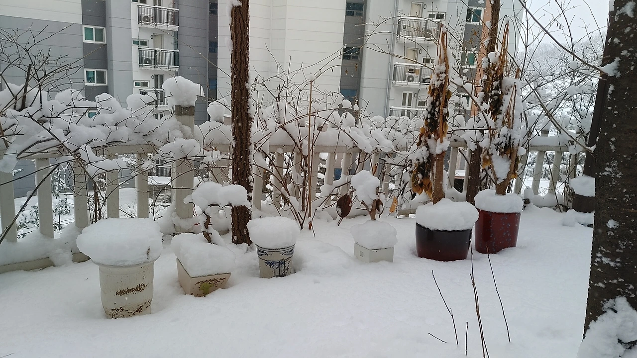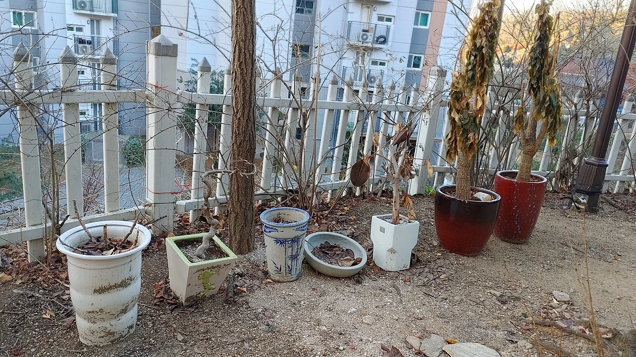 아파트 단지 옆 음달에 화분들이 매서운 바람에 처량한 모습으로 대화를 합니다.