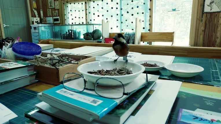 "여보셔요! 제가 작년에 잃어버린 그 새끼새 곤줄박이예요!"라며 눈물을 흘리며 늙은 새를 흔들었지요.