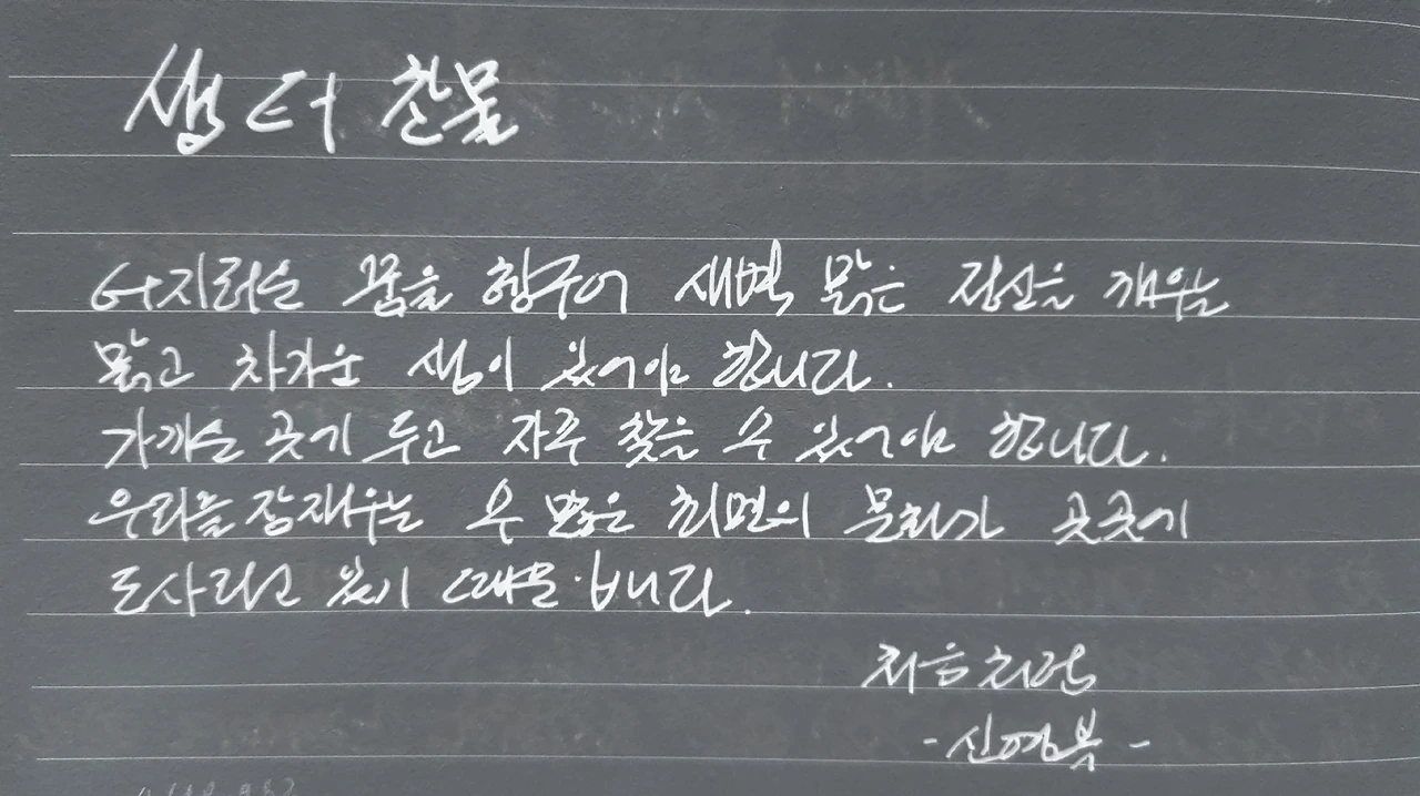 샘터 찬물(('처음처럼' 신영복)어지러운 꿈을 헹구어 새벽 맑은 정신을 깨우는맑고 차가운 샘이 있어야 합니다.가까운 곳에 두고 자주 찾을 수 있어야 합니다.우리를 잠재우는 수 많은 최면의 문화가 곳곳에도사리고 있기 때문입니다.