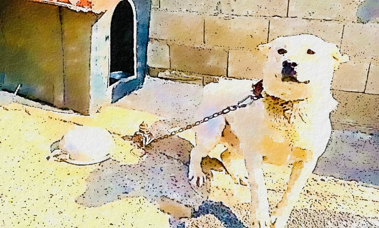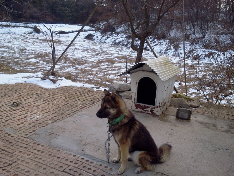 마당에서 목줄에 묶여 개집에서 살고 있는 강아지는