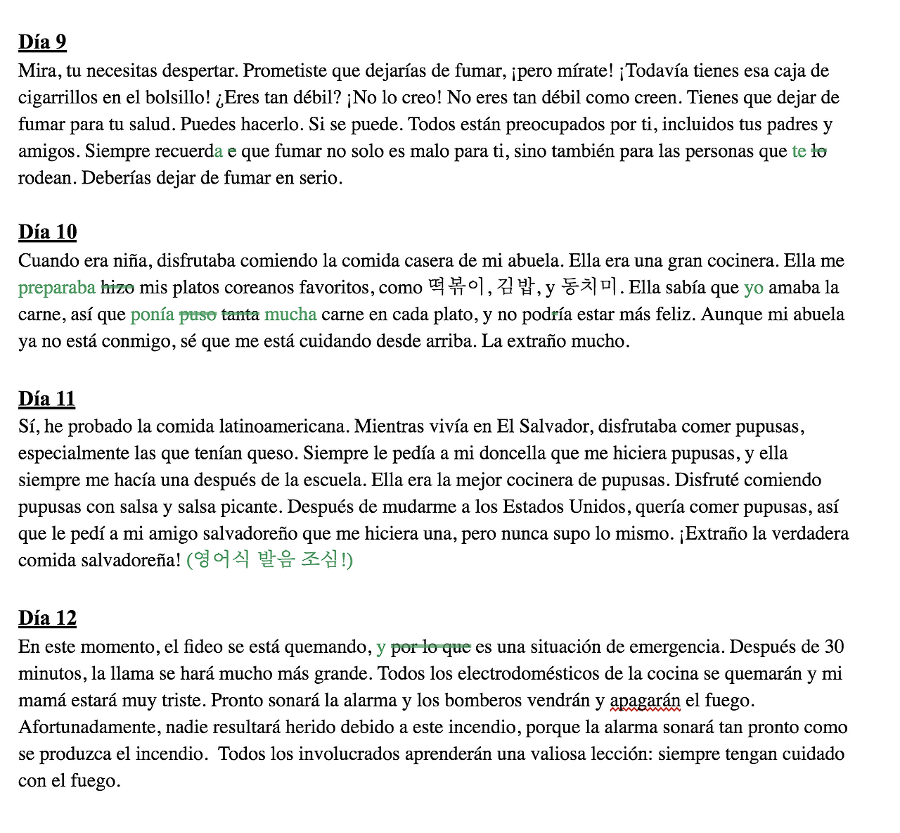 Cuando era niña, disfrutaba comiendo la comida casera de mi abuela. Ella era una gran cocinera. Ella me hizo mis platos coreanos favoritos, como 떡볶이, 김밥, y 동치미. Ella sabía que amaba la carne, así que puso tanta carne en cada plato, y no podría estar más feliz. Aunque mi abuela ya no está conmigo, sé que me está cuidando desde arriba. La extraño mucho.