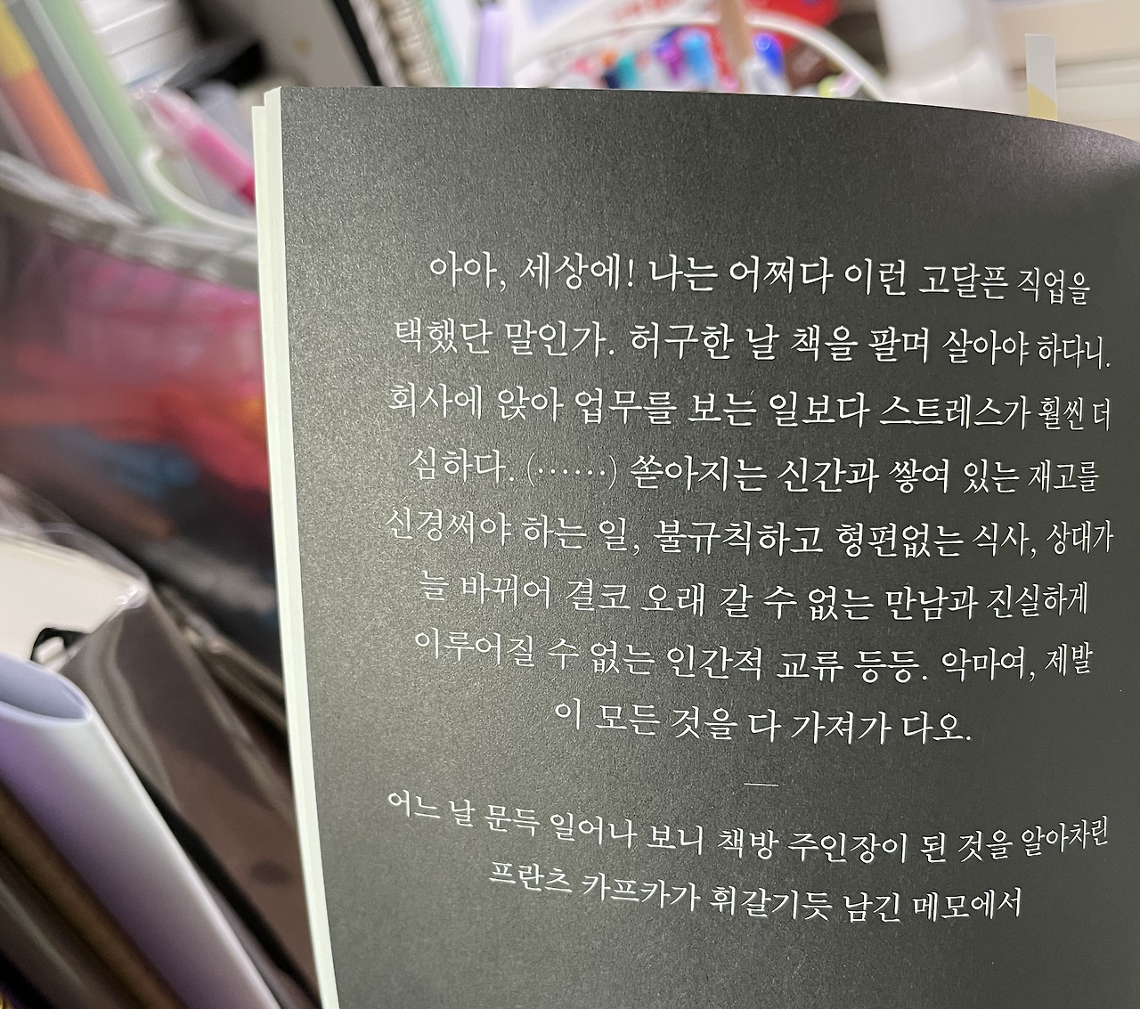 지금부터라도 나와 결이 맞지 않는 사람들을 웃으면서 대처하는 방법을 연마해야겠다는 생각이 들었다. 이 책을 읽지 않았더라면 절대로 생각하지 못했던 부분이었을 거다. 지금도 나는 책방 주인으로써의 달콤한 면만 생각하며 행복한 꿈을 꾸고 있었을지도 모르지. 하지만 이 책을 읽은 이상, 더 이상 달콤한 시선으로만 책방 주인이라는 타이틀을 바라보지는 않을 것 같다. 현실과 타협하되, 다수가 행복할 수 있는 나만의 현명한 방법을 차곡차곡 쌓아 올라가야지.
