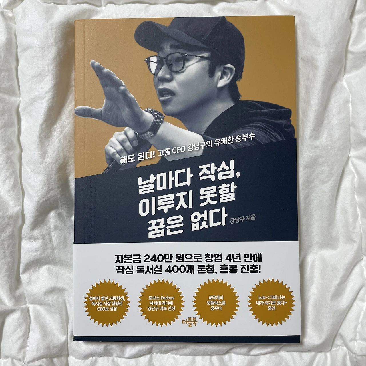 그의 특이한 이름, "강남구"에 얽힌 비하인드 스토리부터, 대학 진학 대신 창업을 선택한 이유, 22살에 억대 연봉을 받고 다독왕 관심 병사가 독서실 사업을 꿈꾸기 까지의 과정이 낱낱이 적혀있다. 관심 병사였다는 부분은 꺼내기 힘들었을 이야기였을 텐데, 솔직하게 오픈하고 힘들었던 군생활을 어떻게 이겨냈는지에 대해 쓴 걸 보면서 입을 다물수가 없었다.