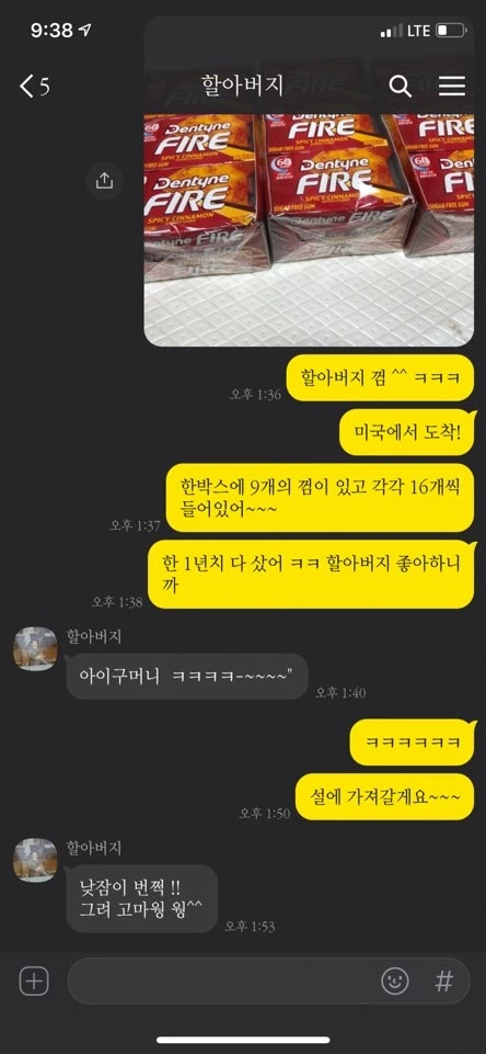 할아버지가 좋아하시는 껌이 왔다고 톡을 보내드렸더니 "낮잠이 번쩍!!" (낮잠 주무시다가 잠에서 번쩍 깨셨다는 이야기) 이라며 고맙다고 하시는 우리 할아버지. 이번 설에 드렸더니 아껴 드신다며 일주일에 두세 개만 드실 거라 하셨다.