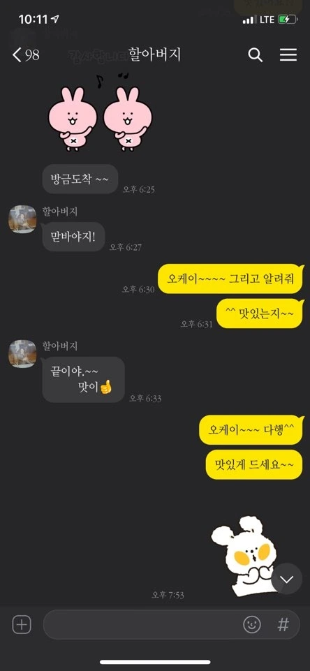 손녀가 드리는 선물이 그다지 큰 선물이 아님에도 불구하고 늘 이렇게 고마움을 표현해주시는 할아버지. 여든을 훌쩍 넘기셨지만, 손녀들과 소통하기 위해 스마트폰을 쓰시고, 카톡을 배우시고 페이스북을 하시는 나의 멋쟁이. 페이스북에 내가 사진을 올리면 늘 "우리 큰 공주 제일 예뻐!"라고 해주시는 나의 비타민. 생일이 되면 제일 먼저 파리바게뜨 케이크 기프티콘을 보내주시고, 내가 세상에서 제일이라며 늘 용기를 주시는 나의 스위트 그랜파파. 당신이 내 곁에 계셔서 늘 든든하다.