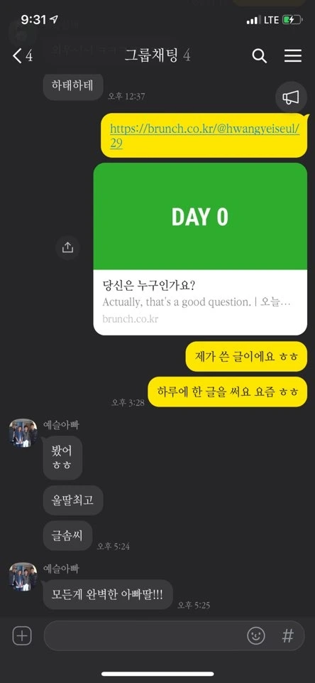 어제 한 달 쓰기의 스타트를 끊었다는 것을 가족들에게 알리기 위해서 가족 채팅방에 <Day 0> 글을 올렸더니 아빠가 내게 해 준 말.