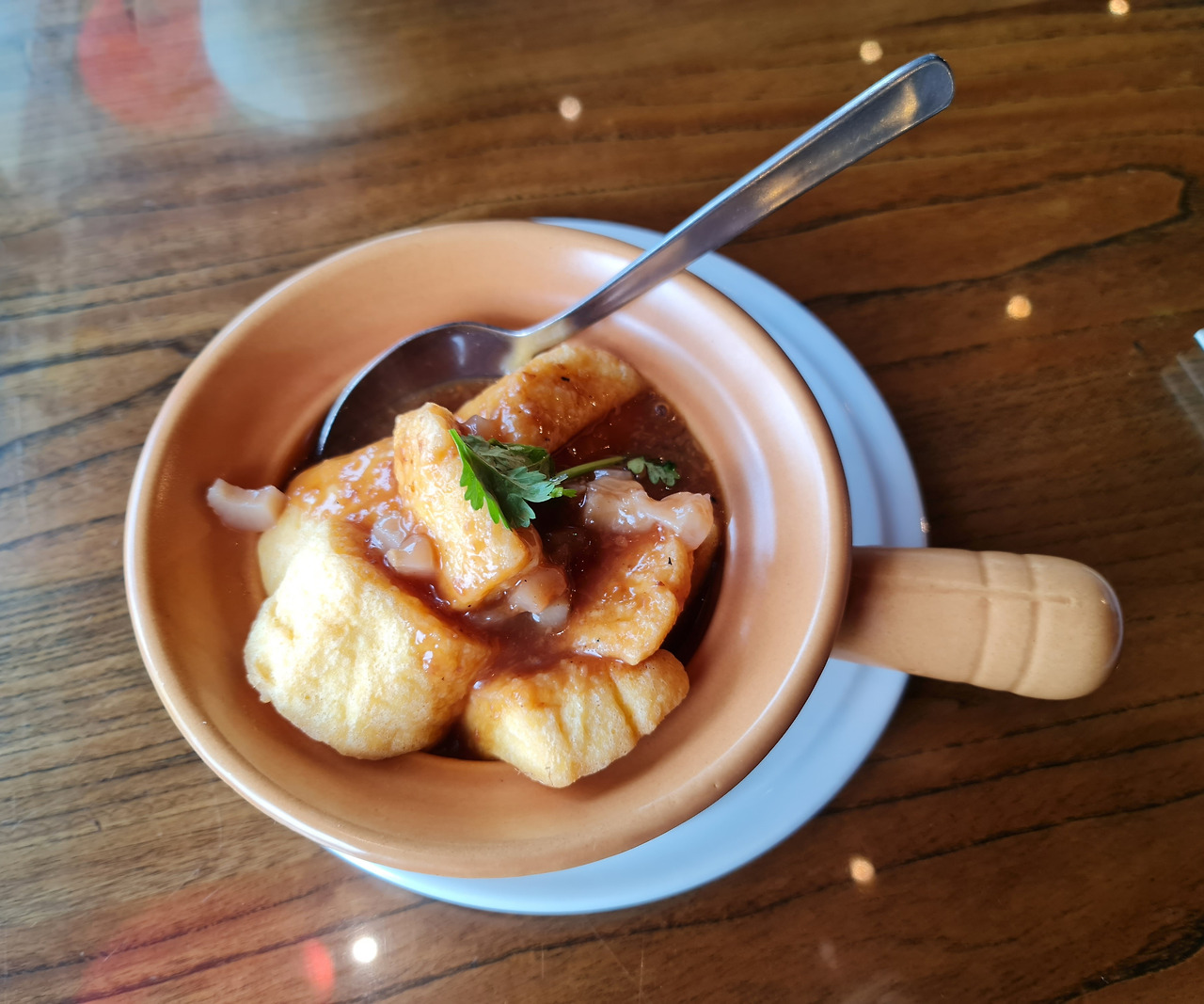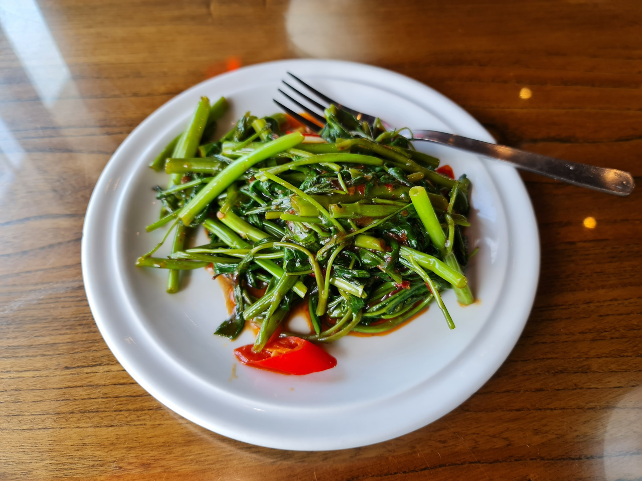 남편과 나는 쉴 새 없이 양상추에 닭고기와 오이를얹어 쌈을 싸 먹었다. 조금 후에 삼발 캉콩이 나왔다. 삼발 캉콩은 약간 매콤한 삼발 소스에 물시금치를 넣어 볶은 음식이다. 칠리 파디라는 고추가 들어가 알싸한 맛이 난다. 마치 흰밥에 겉절이를 얹어 먹는 느낌이었다. 뚝배기에 담겨 나온 두부조림도 부드럽고 맛있었다. 간장에 조린 두부가 아주 부드러웠다.