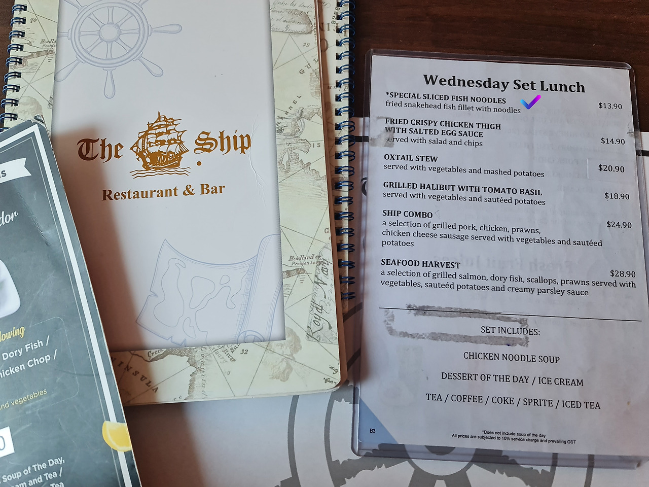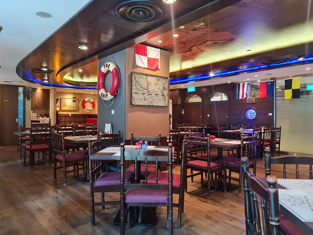 남편이 데려간 식당은 싱가포르의 번화가 오차드로드에 위치한 The Ship Restaurant & Bar(더 쉽 레스토랑 앤 바)였다. 1977년에 문을 연 이 식당은 오랜 전통을 자랑하며, 다양한 서양 요리에 싱가포르식 맛과 조리법을 접목한 메뉴로 유명한 경양식 식당이었다. 식당에 들어가니 대학 시절 자주 가던 학교 앞 호프집처럼 어둑어둑한 분위기가 느껴졌다. 장식용 닻과 조타기, 구명튜브 등 배를 주제로 한 인테리어가 인상적이었다.