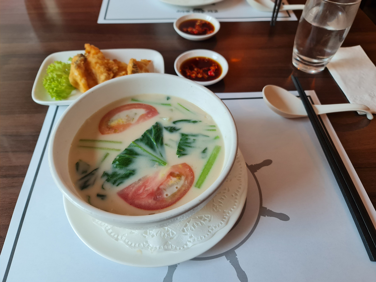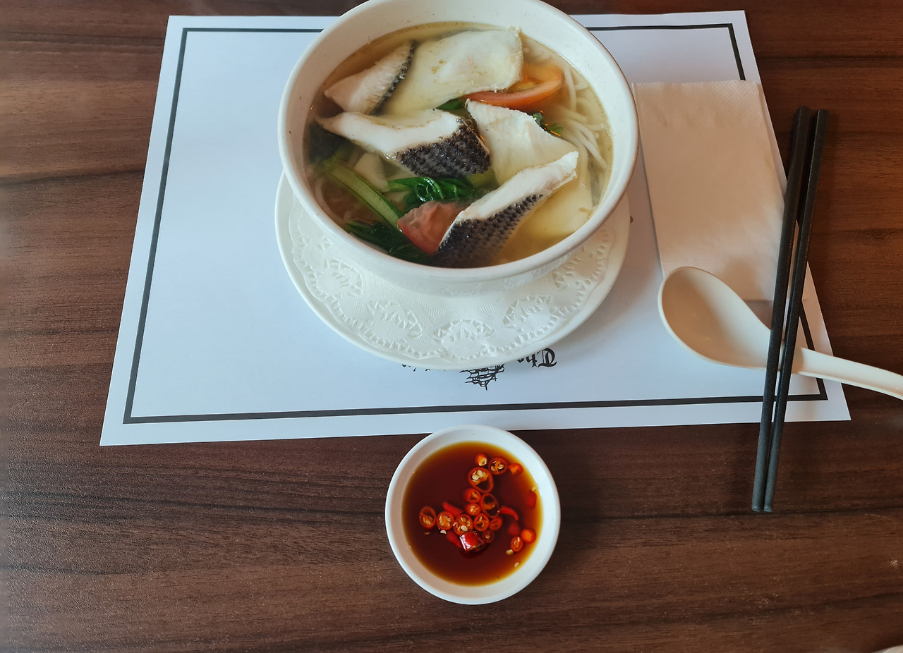 조금 있으니 직원이 생선국수를 가져왔다. 생선 튀김 4조각은 다른 접시에 담아 왔다. 내가 좋아하는 칠리 파디(강렬한 매운맛이 나는 태국 고추) 소스도 함께 나왔다. 먼저 뽀얀 국물을 숟가락으로 한 수저 떠먹었다. 생선뼈를 푹 고은 육수에 우유를 첨가해 부드럽고 진한 풍미가 났다. 청경채, 토마토, 생강 등이 들어가 비린내 없이 깔끔하고 맛있었다. 비훈(쌀국수)은 가볍고 부드러워 국물 맛을 잘 머금었다.