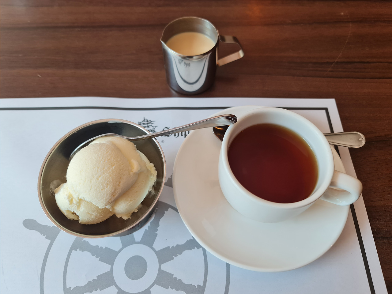 아이스크림과 홍차. 홍차가 연해서 연유를 넣어 마시지 않았다. 주로 커피를 주문하는데 이 날은 홍차를 주문했다. 콜라나 사이다 등과 같은 탄산음료를 선택할 수도 있다.