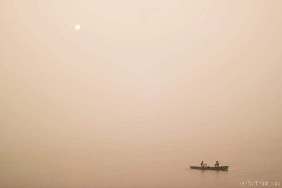바라나시의 갠지스는 경계가 희미하다. 나는 매일 해뜨는 시각에 갠지스를 보았다. 일주일이면 사흘은 날이 맑고 나흘은 흐리다. 안개가 자욱한 날에는 강과 육지와 하늘의 경계가 확실치 않다. 강물 어딘가에서 해가 떠오른다. 하늘이 아니라.