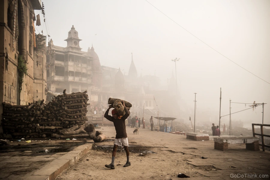 하루에 한번쯤은 화장터를 찾았다. 숙소에서 강을 따라 위로가든 아래로 가든 화장터를 만났기에 그리 특별한 일은 아니다. 해뜨는 시각에 찾은 화장터는 오히려 더 동적이었다. 장례는 없었으나 갠지스 강을 타고 내려온 나무들이 곳곳으로 이동했다. 나무 배 위의 나무 장작. 장작을 하염없이 바라보다 문득 며칠전에 들었던 키로그램당 80루피는 너무 비싸다는 생각이 들었다. 다른 상점에 가서 다시 물어보니 키로그램당 2루피란다. 또 다른 상점은 20루피. 또또 다른 상점은 10루피. 정가가 있으리라 생각한 내 잘못이었다. 흥정은 태어나서 죽을 때 까지 하는 것이다. 다만 이렇게 큰 가격차이는 장작의 종류에 기인하는 편이다. 화력이 높고 잘타는 좋은 나무가 있다. 그렇지 않은 나무도 있다. 부유하거나 높은 카스트의 망자는 조금 더 비싼 장작에서 탄다. 싼 장작에 비싼 장작 몇 덩이를 추가하는 경우도 있다. 일종의 배려다.