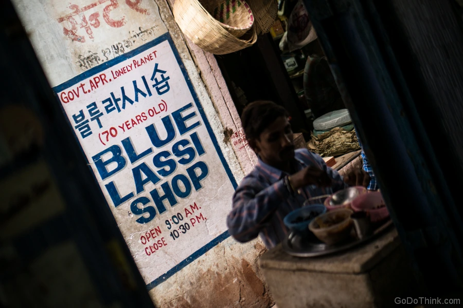 골목을 따라 조금 더 가보니 블루라씨로 향하는 표지판이 보인다. 골목의 구석구석마다, 관광객이 발길을 놓치지 않도록 벽면에 페인트로 칠해놨다. 그 파란 광고판을 따라 가보니 이미 많은 관광객들이 자리를 잡고 있다. 아침에 이미 다른 집에서 먹은 라씨이기에 간단한 플레인 라씨를 시키고 자리에 앉았다. 사람이 많아 얼마간을 기다려야했다. 그 기다림에도 시신 두구가 블루라씨 앞 골목길을 지나간다. 시신을 든 사람들은 특유의 노래를 부르며. 그리고 쌀을 뿌리며.