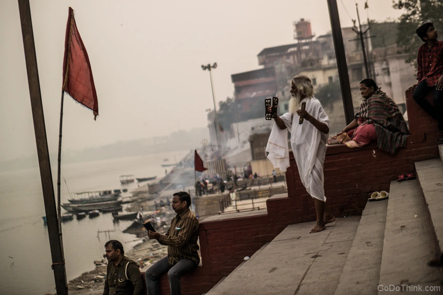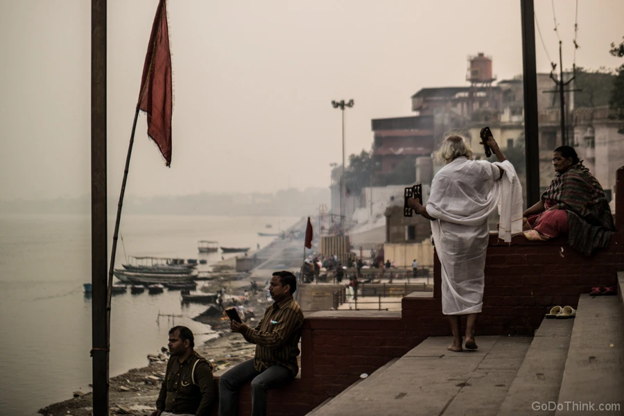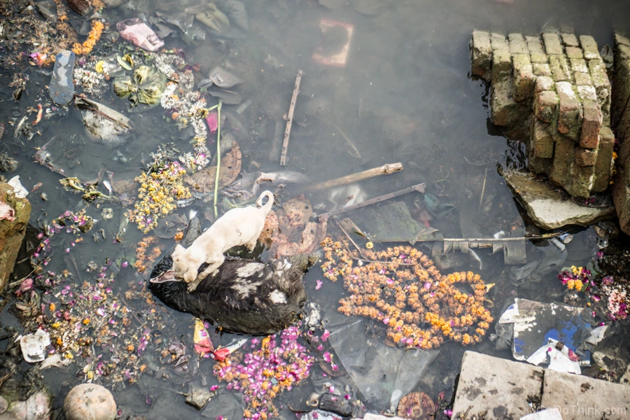 강아지가 죽은 무언가를 물어뜯는다. 머리가 없는데 털을 보니 염소인 듯하다. 그 옆의 한 강아지는 동그란 무언가를 주워 뜯는다. 무엇인지 모르겠지만 그 염소의 머리통으로 추측된다. 여느 가트와는 다른 느낌이다. 어느 누구도 강아지의 행태를, 강가의 오물을 신경쓰지 않는다. 한 발자국. 경계를 넘었을 땐 삶의 다른 모습이 있다. 네팔에서 이미 화장을 보고 왔으나 그 느낌은 전혀 다르다. 갠지스의 화장은 조금 더 인위적이지 않다. 이런 표현을 해도 괜찮을지 모르겠는데 노골적이라는 표현이 적합한 듯 하다. 어느 한 곳에서만 화장이 진행되는 것이 아니다. 강가에서도 그 옆 사원에서도, 계단을 올라가도, 어느 구석에서도 화장이 진행된다. 네팔의 그것은 재만 남으면 강으로 모든 것을 밀어넣었는데, 이곳에서는 그것도 없는 듯 보였다. 재 위에 장작이 다시 올려진다. 그리고 또 다른 시신이 안치된다. 덮이는 나무도, 연기를 내는 젖은 지푸라기도 네팔에 비해 턱없이 적은 듯 하다. 장작의 길이와 시신의 신장이 맞지 않는 듯 정강이 이상이 장작 밖으로 나온 것도 흔하다. 타고 남은 몸통과 머리가 그대로 장작 위에 올려져 있는 것도 흔하다. 다시 말하지만 조금 더 노골적이다.