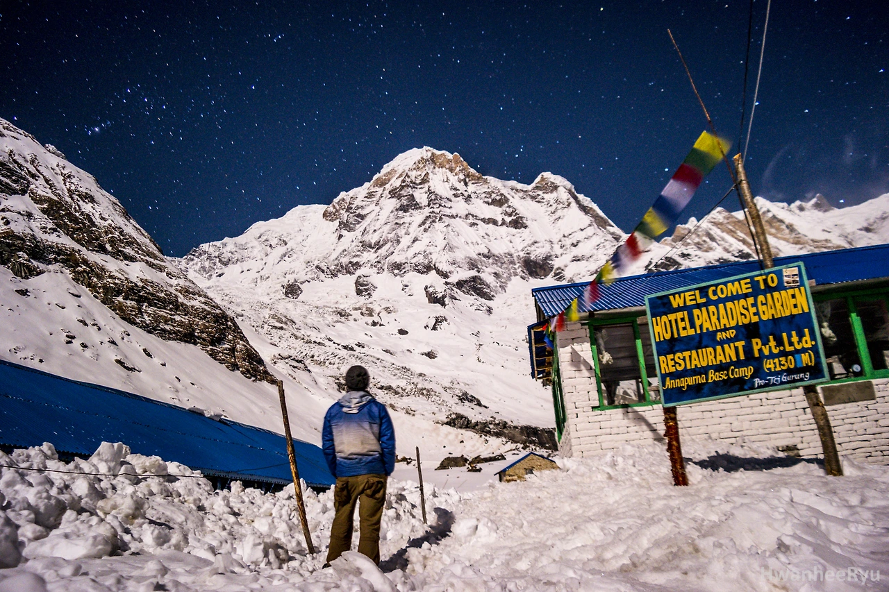 고산병 예방을 위해 다이아목스 반알을 삼키고 잠을 청했다. 이 약의 부작용은 과한 이뇨작용이라 수없이 잠에서 깨서 화장실을 가야만 했다. 소변량에 한번 놀래고 고산병이 전혀 영향을 끼치지 않는다는 사실에 한번 안도했다. 짜증을 낼법한 들락거림에도 좋았던 것은 안나푸르나의 밤 하늘을 수없이 마주할 수 있었던 것이었다. 화장실로 갈 때마다 하늘을 보았다. 안나푸르나 맞은편에 피어난 보름달은 하얀 산을 더 하얗게 비추었다. 산은 산대로 하늘은 하늘대로 제 모습을 드러내고 있었다. 멍하니 산을 바라봤다. 안나푸르나, 안나푸르나 2, 마차푸차레... 한 봉우리에 몇 분을, 그 봉우리 주변의 별들에 또 몇 분을. 그러다 발끝과 손끝이 살살 시려오면 숙소로 향했다. 놀랜 소변량만큼의 물을 또 섭취하고 침낭으로 기어들어가 남아있던 차가움에 몸서리치면 어느덧 잠이 들었다. 잠결에도 방광이 묵직해지는 게 느껴지는 듯했다.
