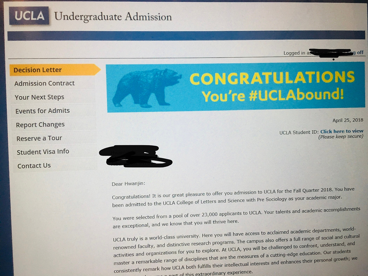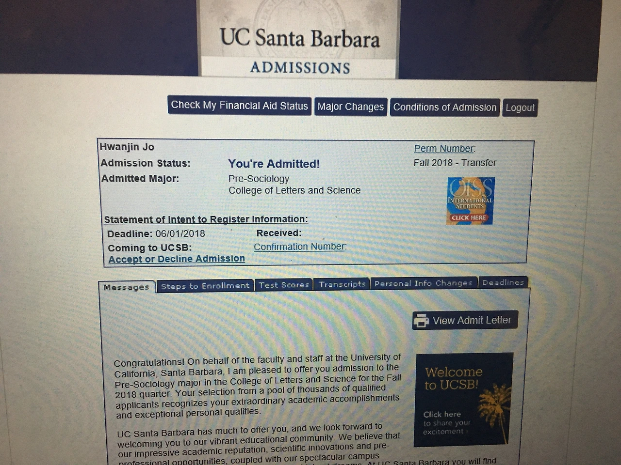 6개 학교가 한 번에 나오지 않는다. 학교들은 불친절하게도 편입 결과 날짜를 정확하게 알려주지 않는다. 대충 이쯤에 결과가 나올 테니까 알아서 확인하라는 식이다. 동기들 소문으로는 UCSB의 결과가 가장 먼저 나온다 했다. 나는 거의 2주일간 매일 그 학교 사이트를 들어가면서 결과를 확인했다. 이 학교는 나의 애간장을 제일 많이 태웠었는데, 왜냐하면 내 결과가 다른 동기들에 비교해서 늦게 나왔기 때문이었다. 결국 결과가 나왔고 나는 최종 합격 통보를 받았다.