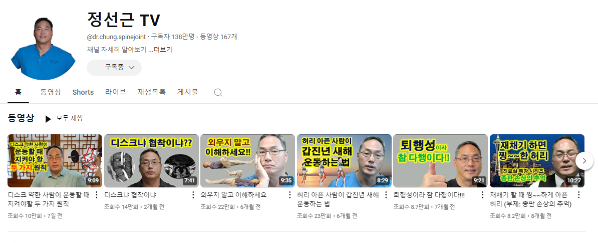 누워서 정선근 교수의 유튜브만 줄곧 보았다. 그리고 아픈 사람들의 유튜브를 많이 찾아보았다. 나처럼 허리디스크로 고생하는 사람들의 브이로그부터, 더욱더 중병으로 앓는 사람들의 영상을 계속 틀어놓았다. 나보다 더 힘든 상황에 있는 사람을 보면서 위안을 느끼는 건 비겁한 행동인데, 그걸 알면서도 건강한 사람들의 영상을 볼 수가 없었다.